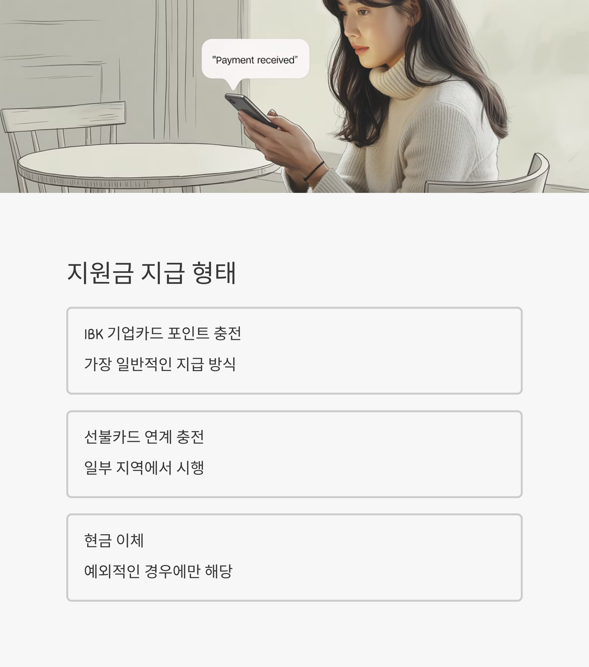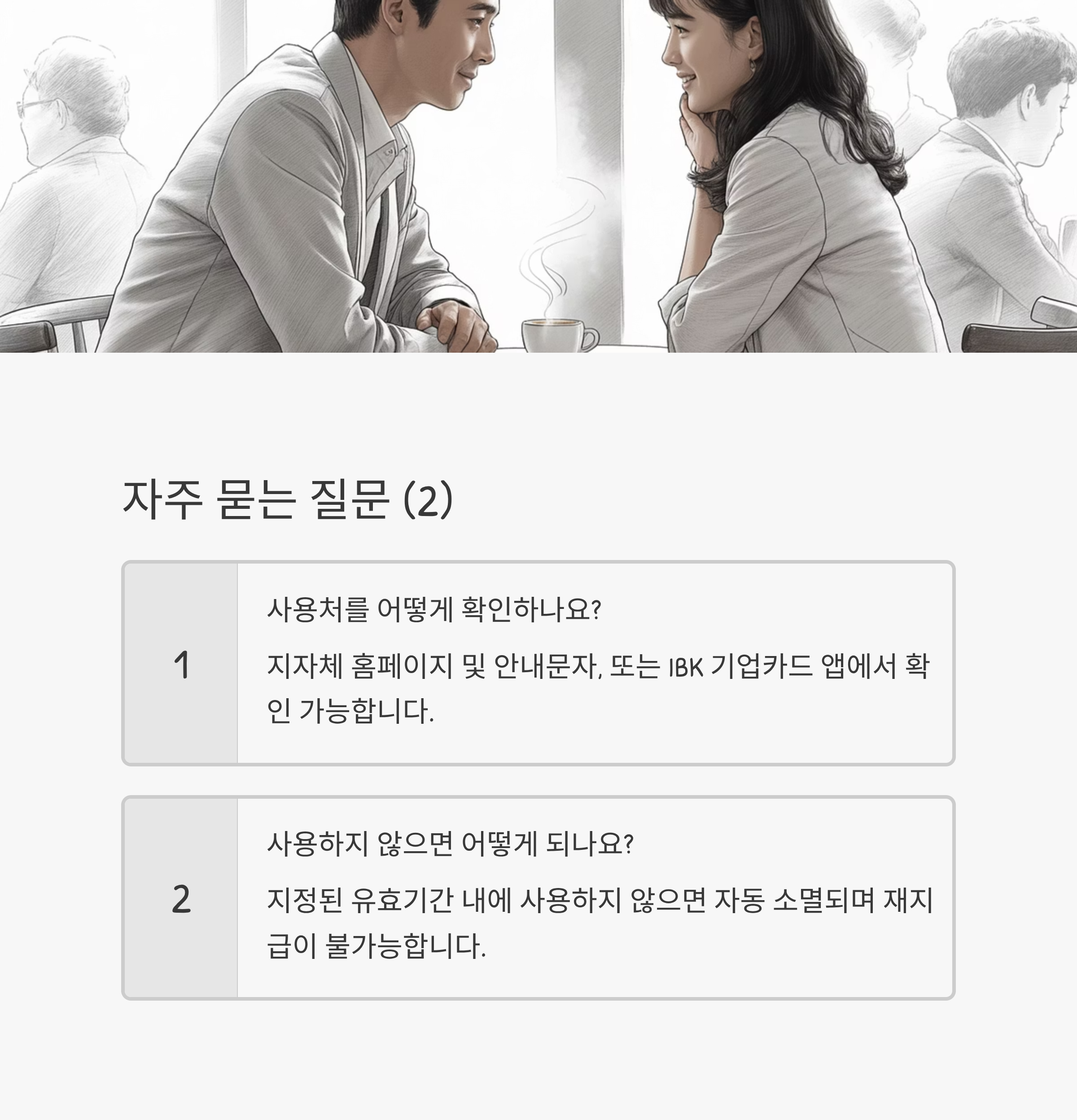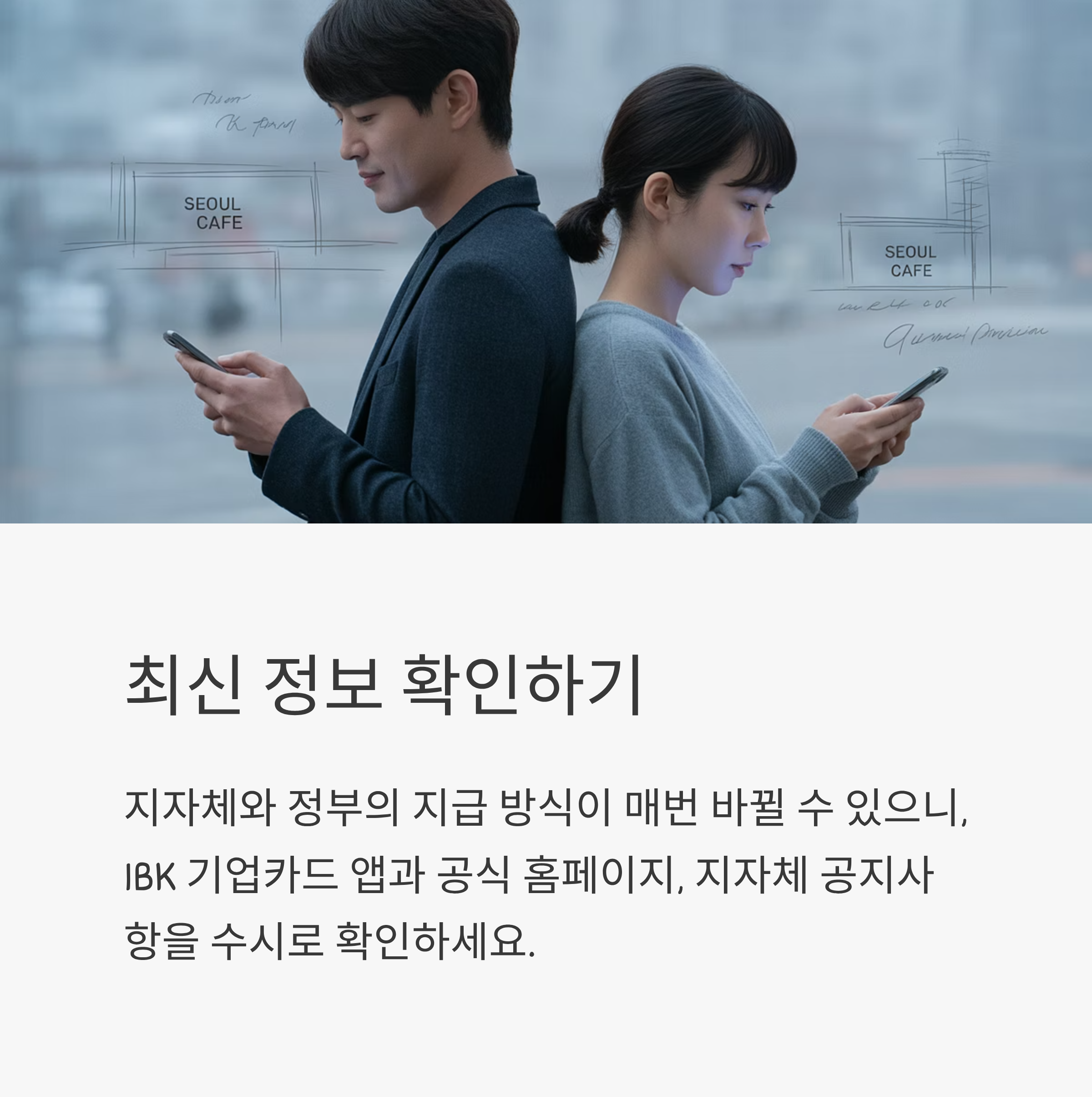 지자체와 정부의 지급 방식이 매번 바뀔 수 있으니, IBK 기업카드 앱과 공식 홈페이지, 지자체 공지사항을 수시로