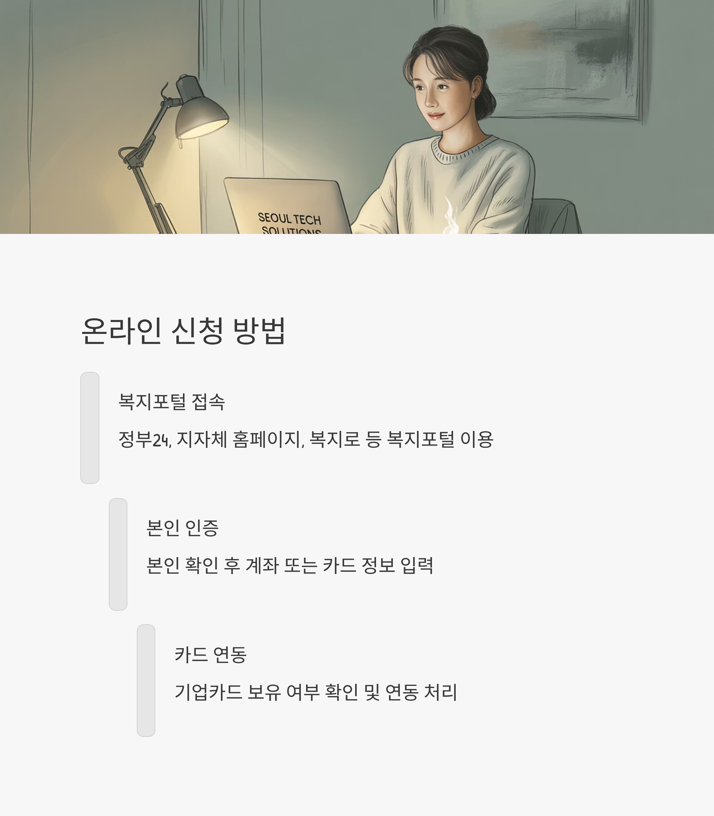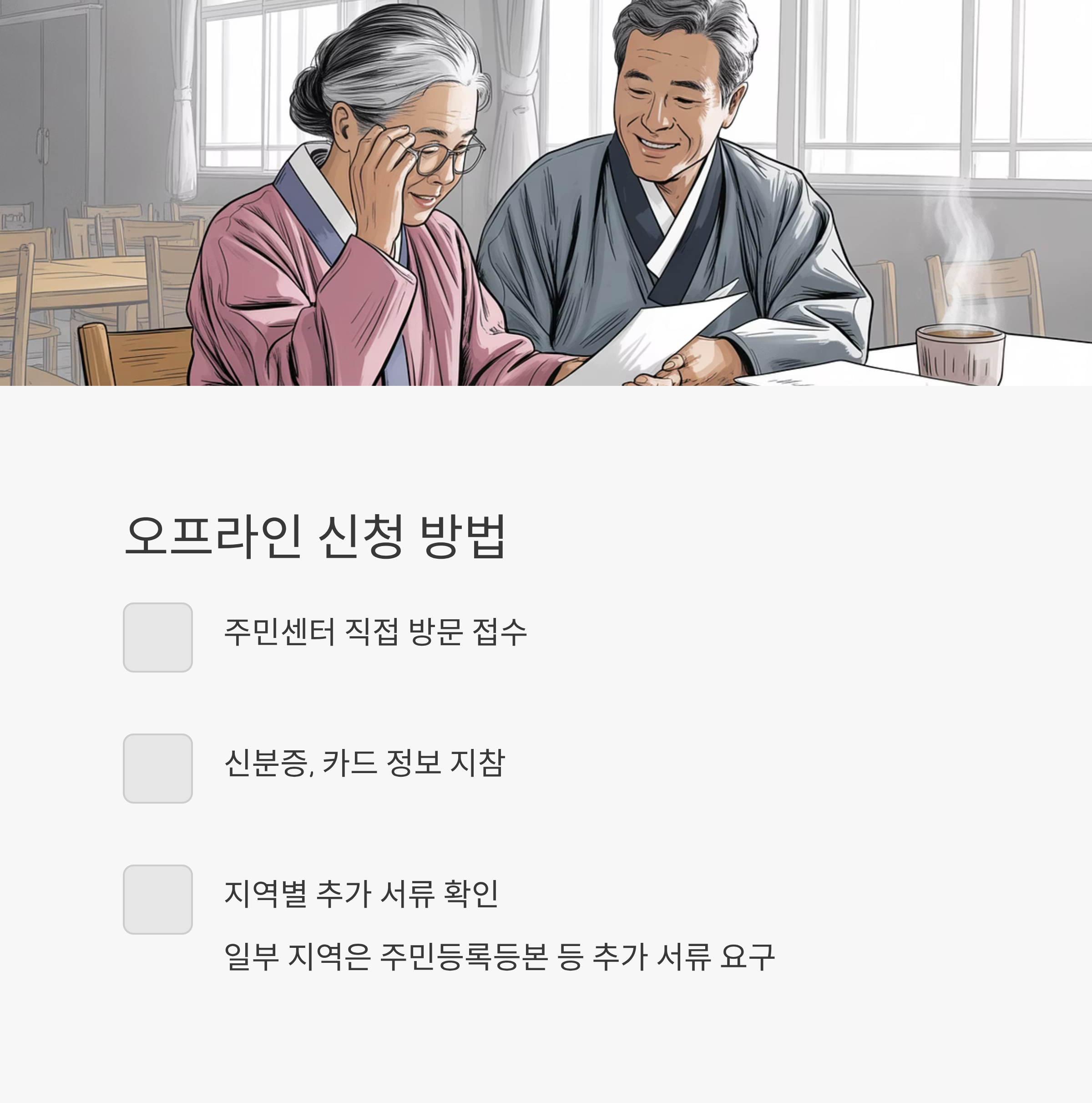 A2. 온라인 신청이 더 빠르며, 카드 연동도 자동 처리되어 간편합니다. 단, 지역 정책에 따라 오프라인 접수만 가능한