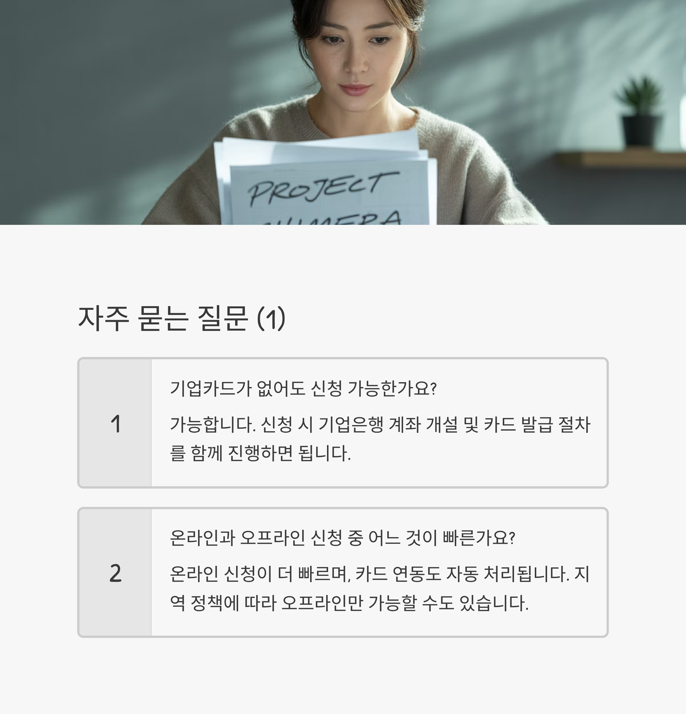 A1. 가능합니다. 신청 시 기업은행 계좌 개설 및 카드 발급 절차를 함께 진행하면 됩니다.