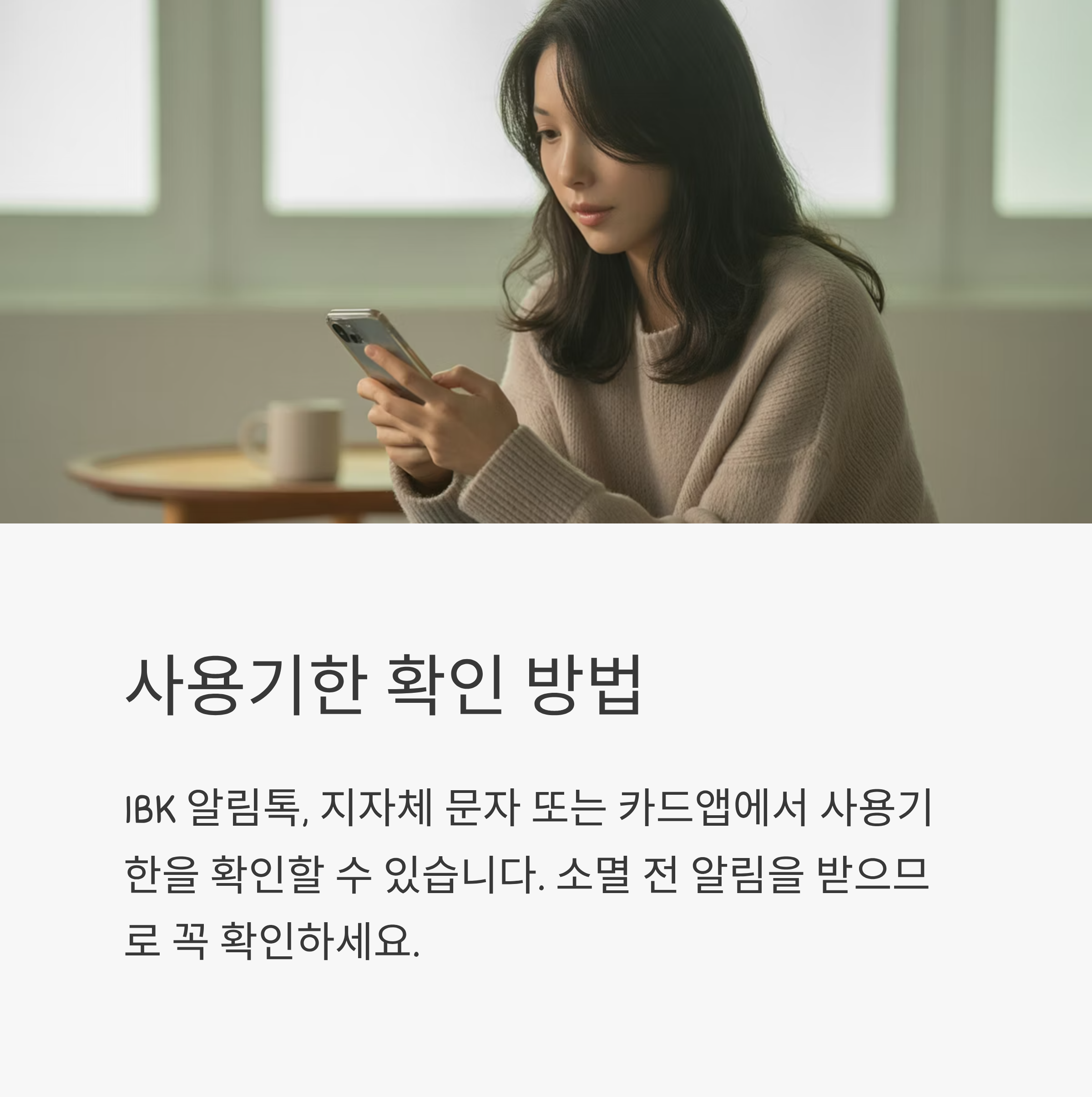 ✔ IBK 알림톡, 지자체 문자 또는 카드앱에서 사용기한 확인 가능