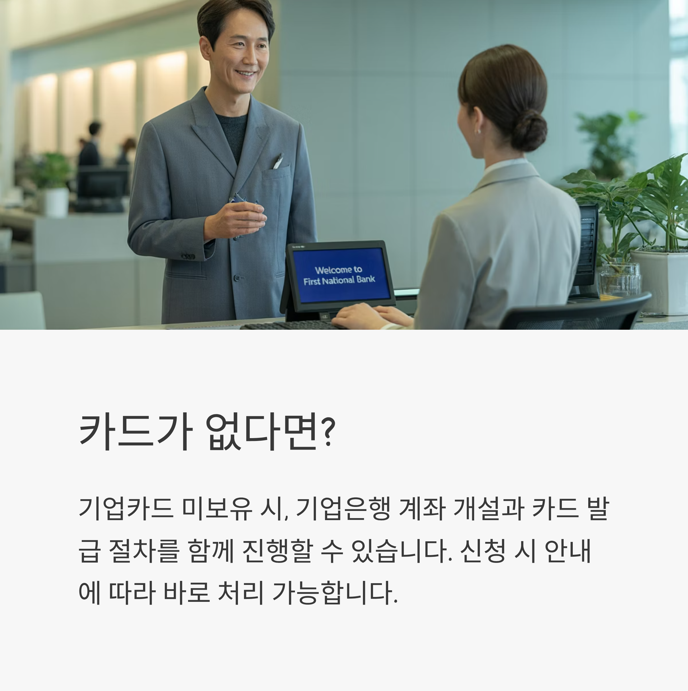 ※ 기업카드 미보유 시, 기업은행 계좌 개설과 카드 발급 절차를 함께 진행할 수 있습니다.