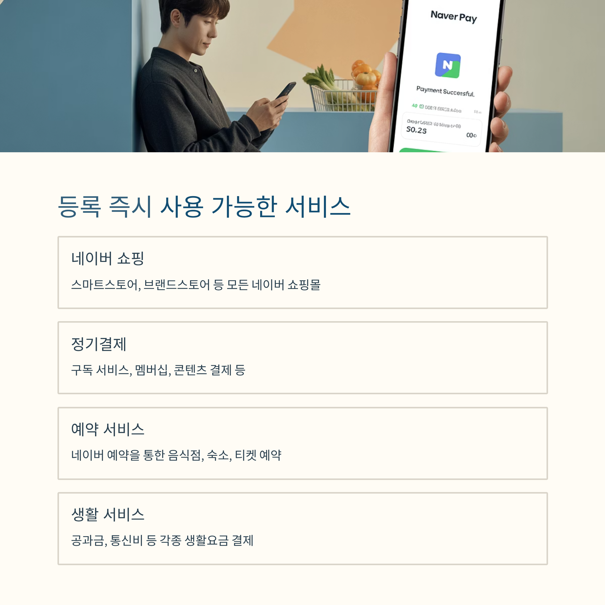 네이버페이에 등록된 신용카드는 온라인 쇼핑뿐만 아니라 예약·정기결제에도 활용 가능합니다.