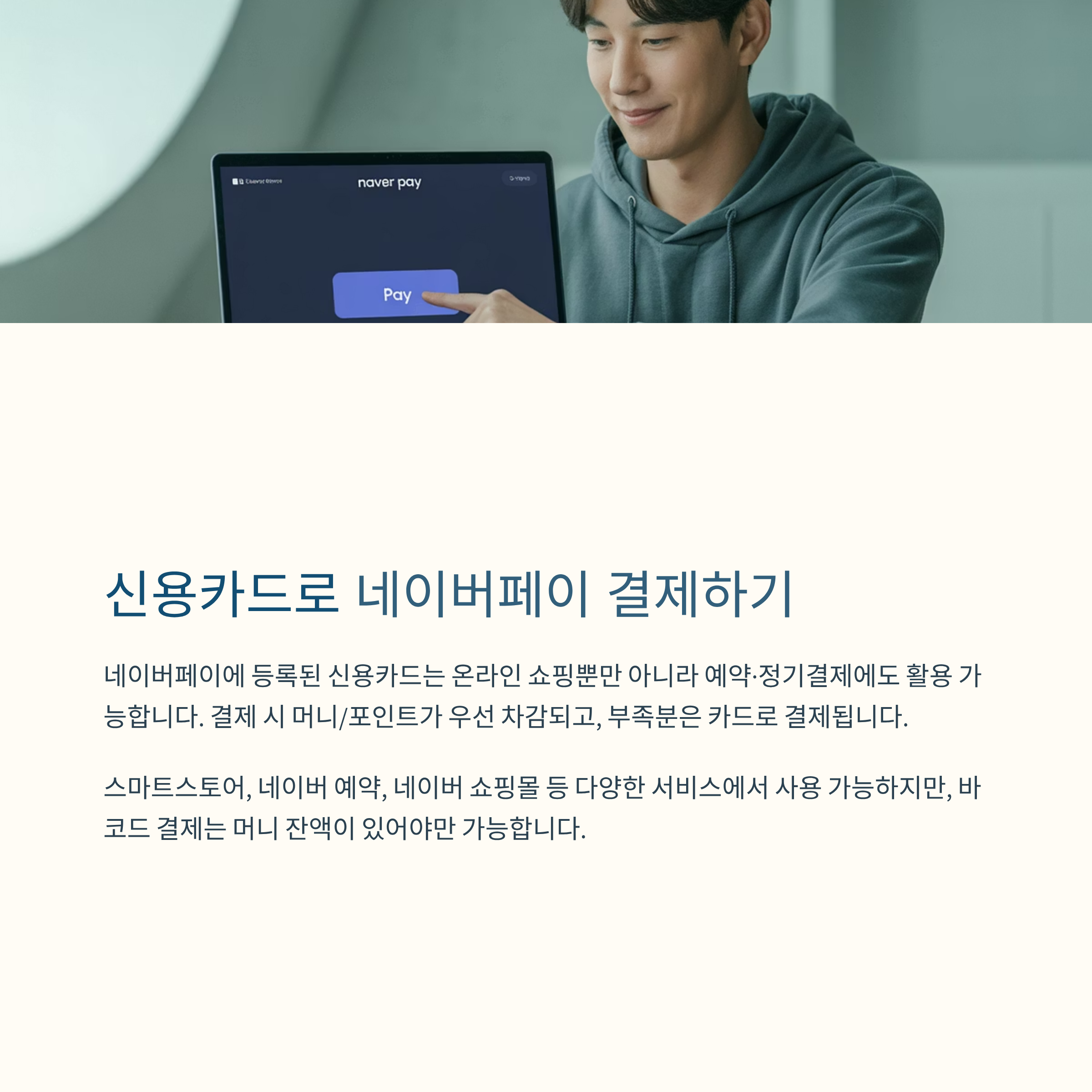 네이버페이는 국내 대표 간편결제 서비스로, 쇼핑·정기결제·예약 등 다양한 분야에서 사용됩니다.