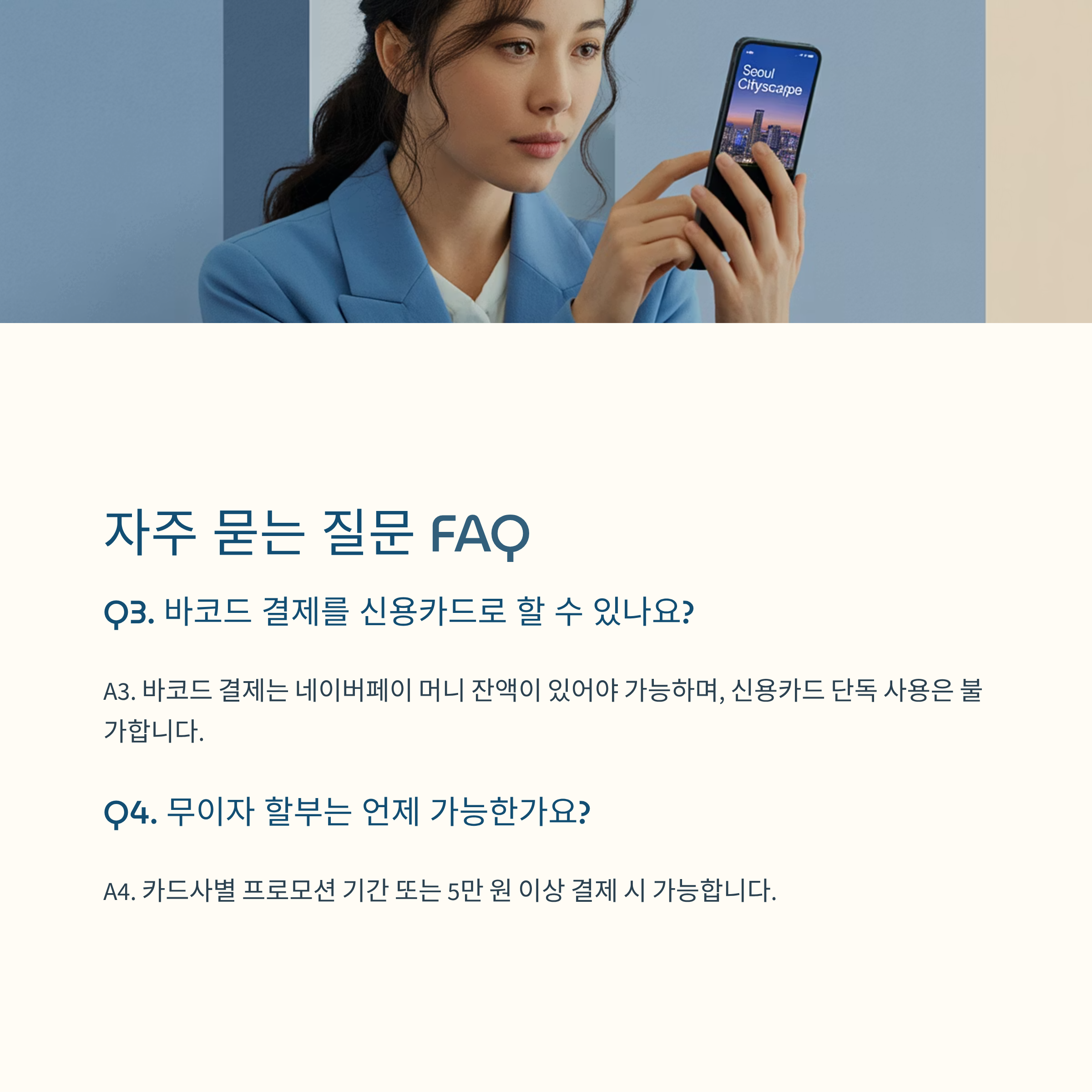 A3. 바코드 결제는 네이버페이 머니 잔액이 있어야 가능하며, 신용카드 단독 사용은 불가합니다.