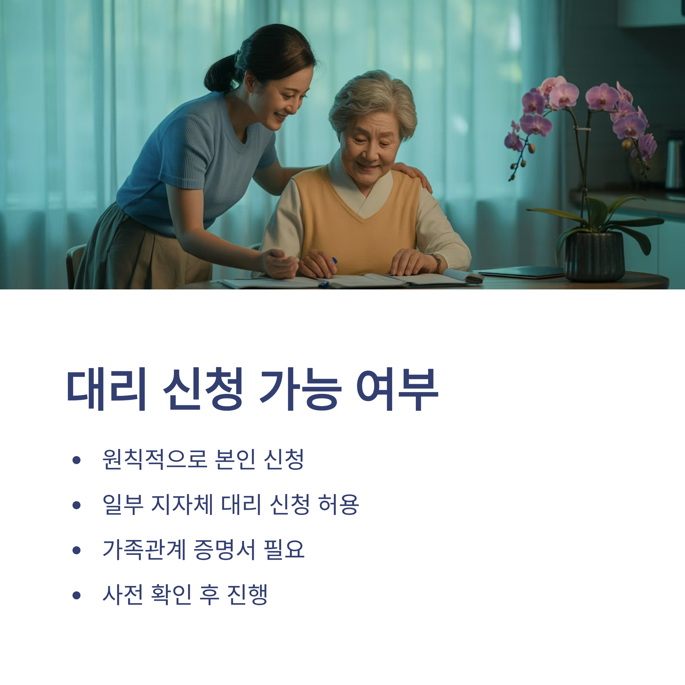 A8. 원칙적으로 본인 신청이 원칙이지만, 대리 신청이 가능한 지자체도 있으니 사전 확인이 필요합니다.