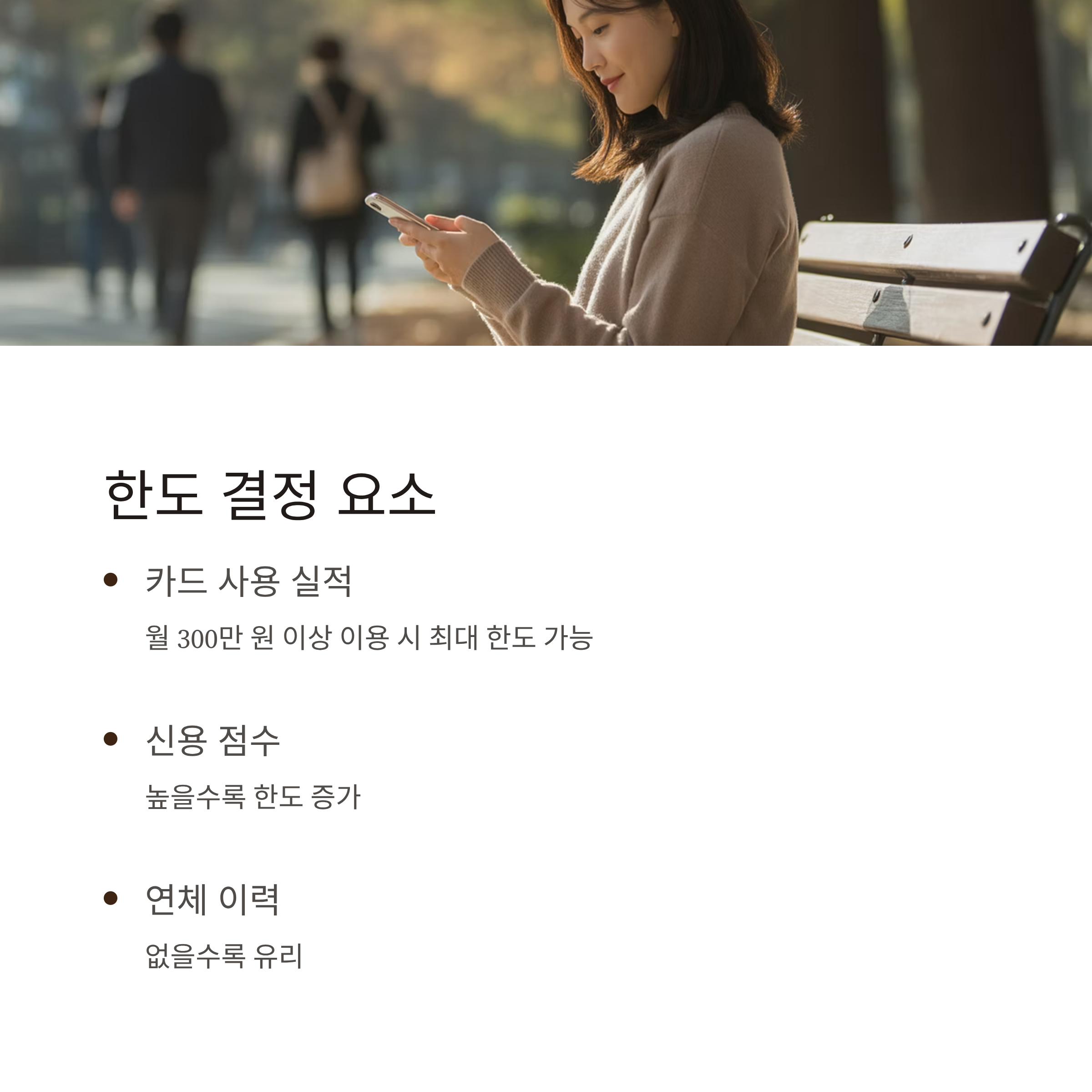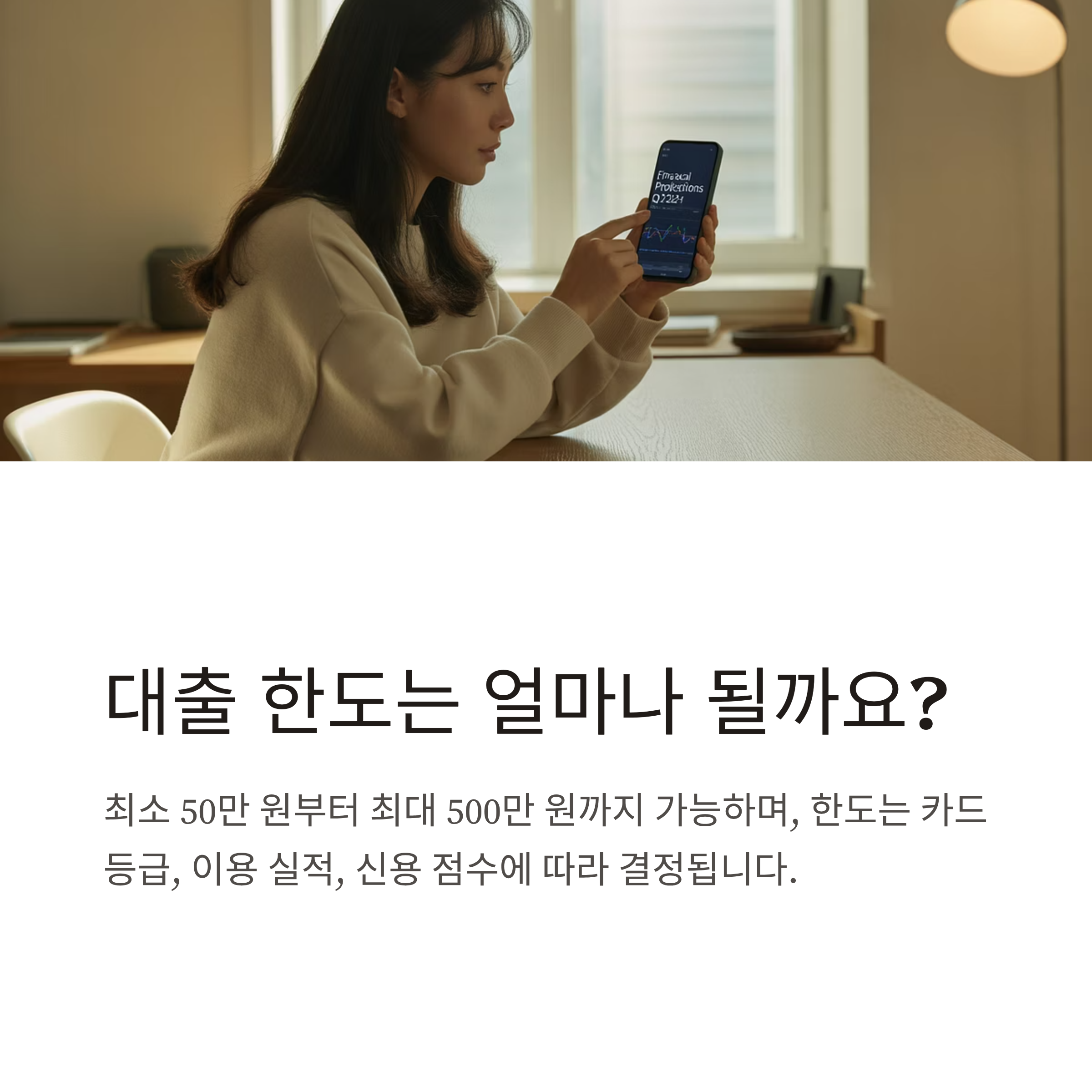 ✅ 카드 사용이 활발하고 연체 이력이 없는 고객은 최고 한도 가능 ✅ 사용 실적이 적거나 신용점수가 낮은 경우 한도 제한 가능 ✅ 카드 한도 내 대출 가능, 초과 불가