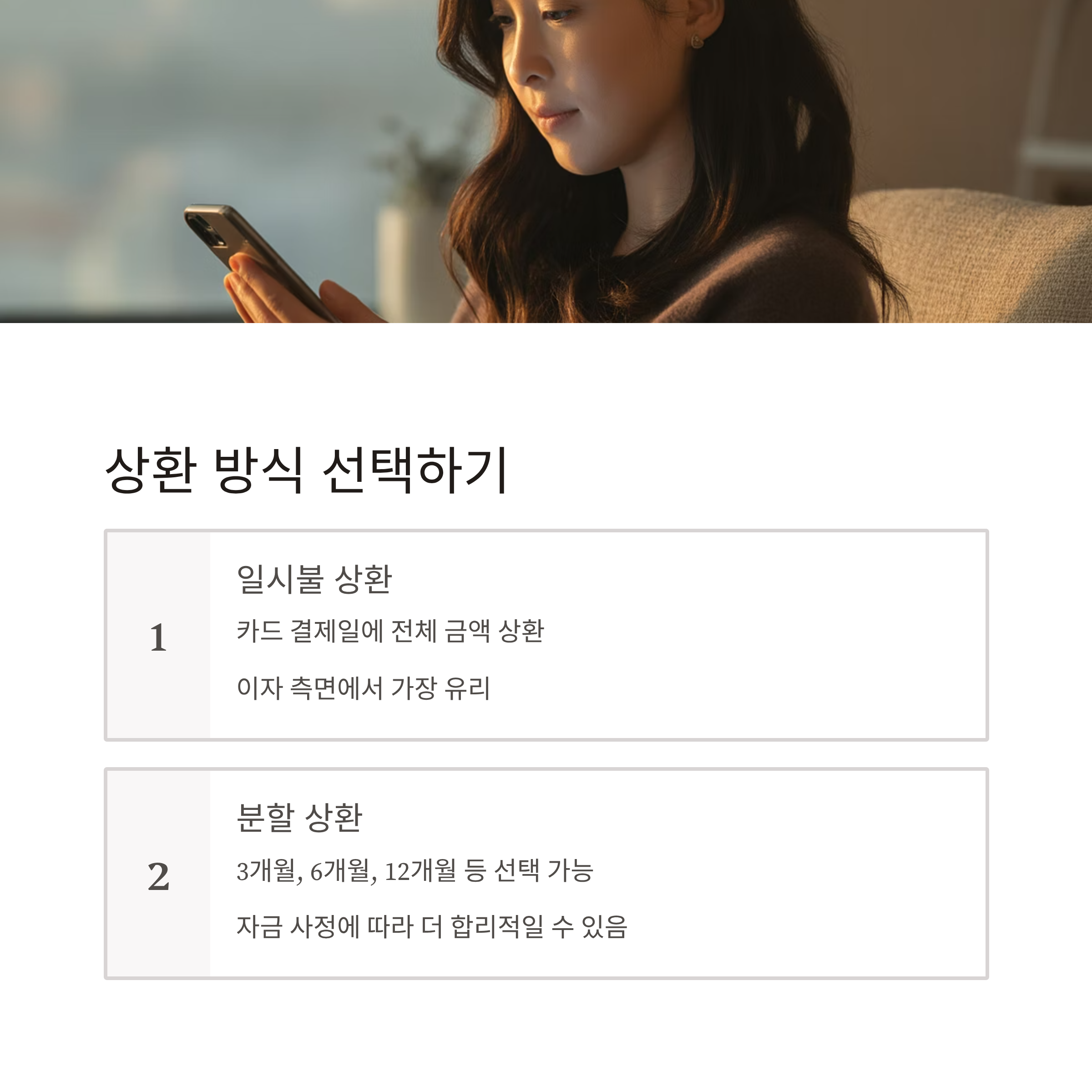 분할 상환 선택 시 이자가 더 부과되므로, 총 상환 금액을 반드시 확인하세요.