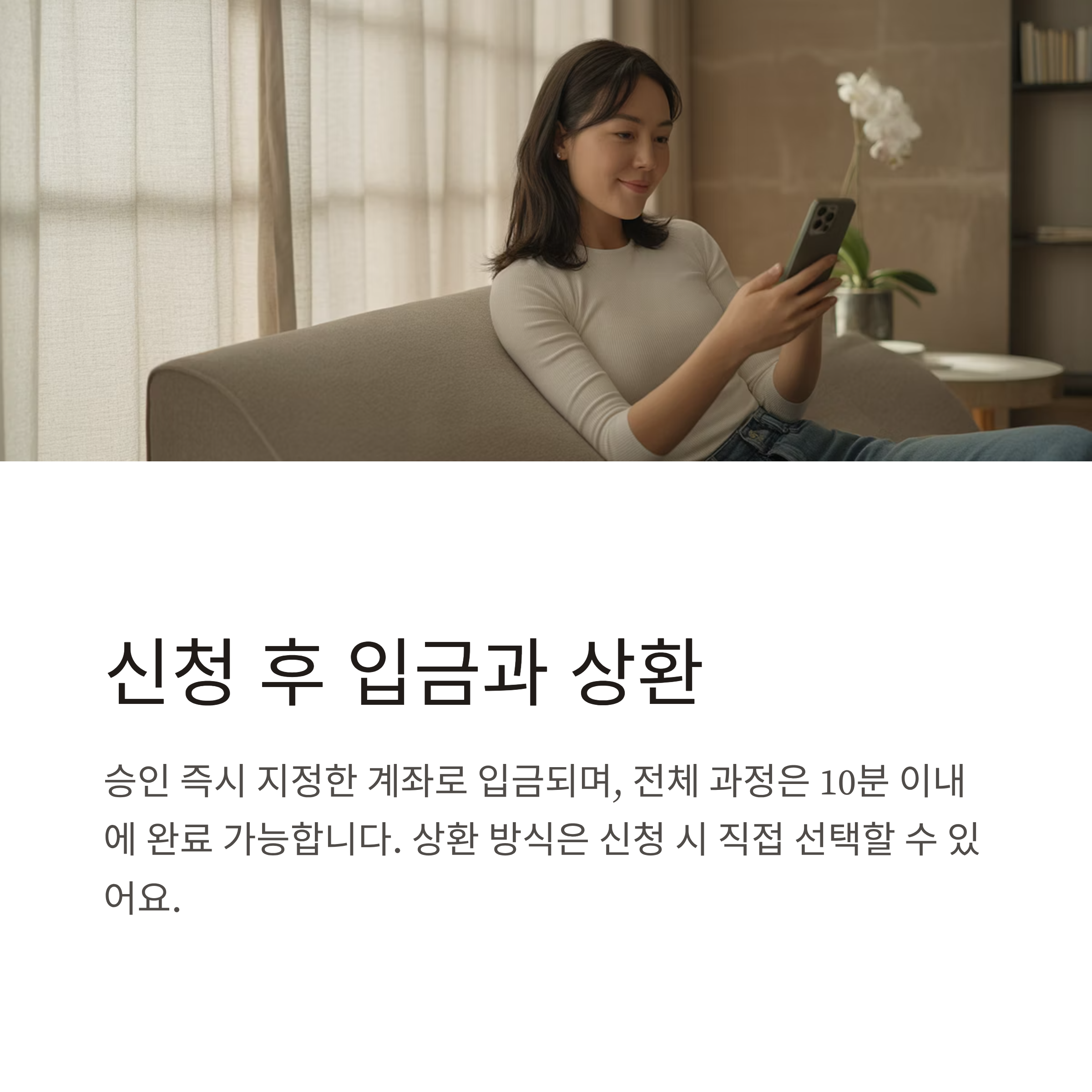 대출금은 신청 즉시 지정 계좌로 입금되며, 상환은 일시불 또는 분할 방식 중 선택할 수 있어