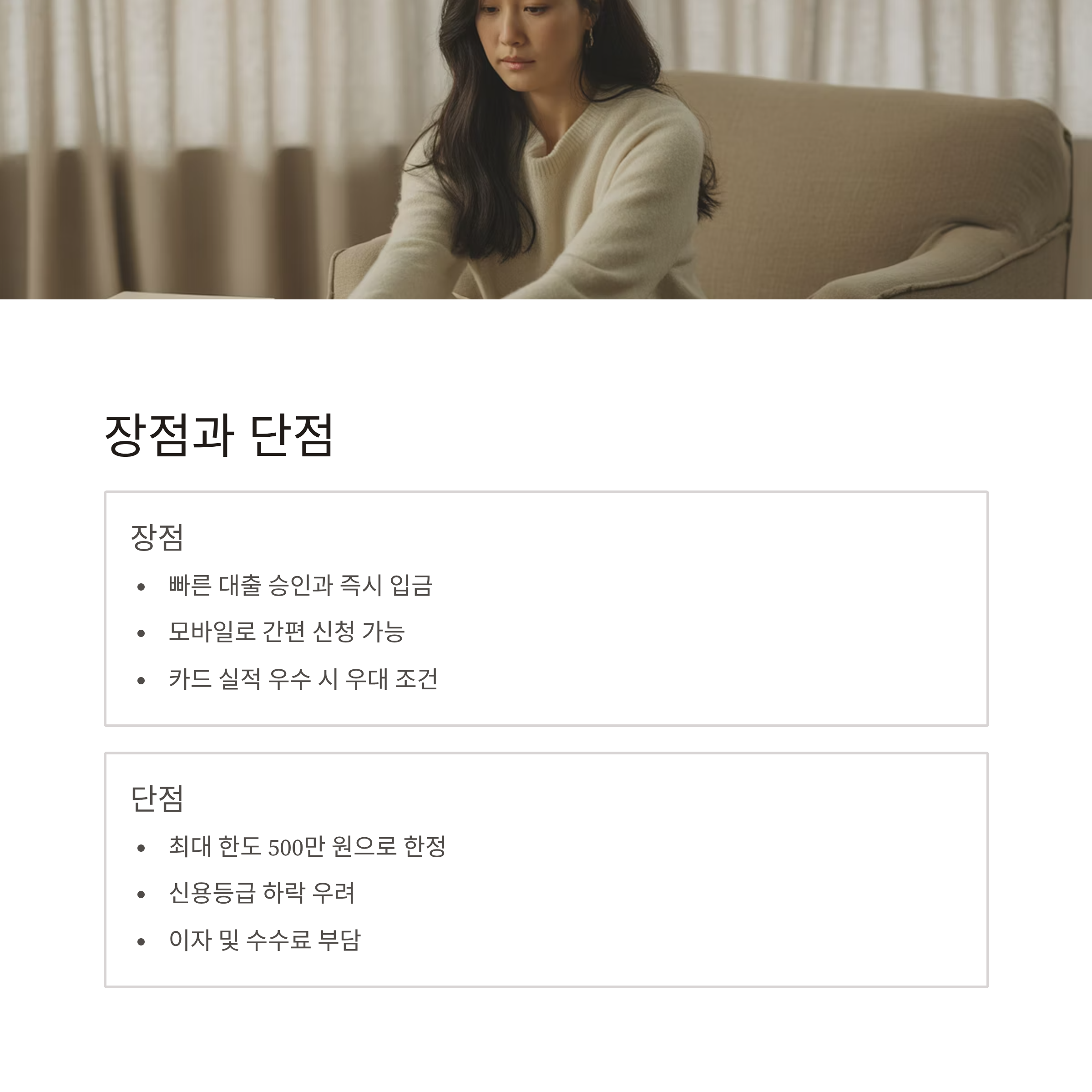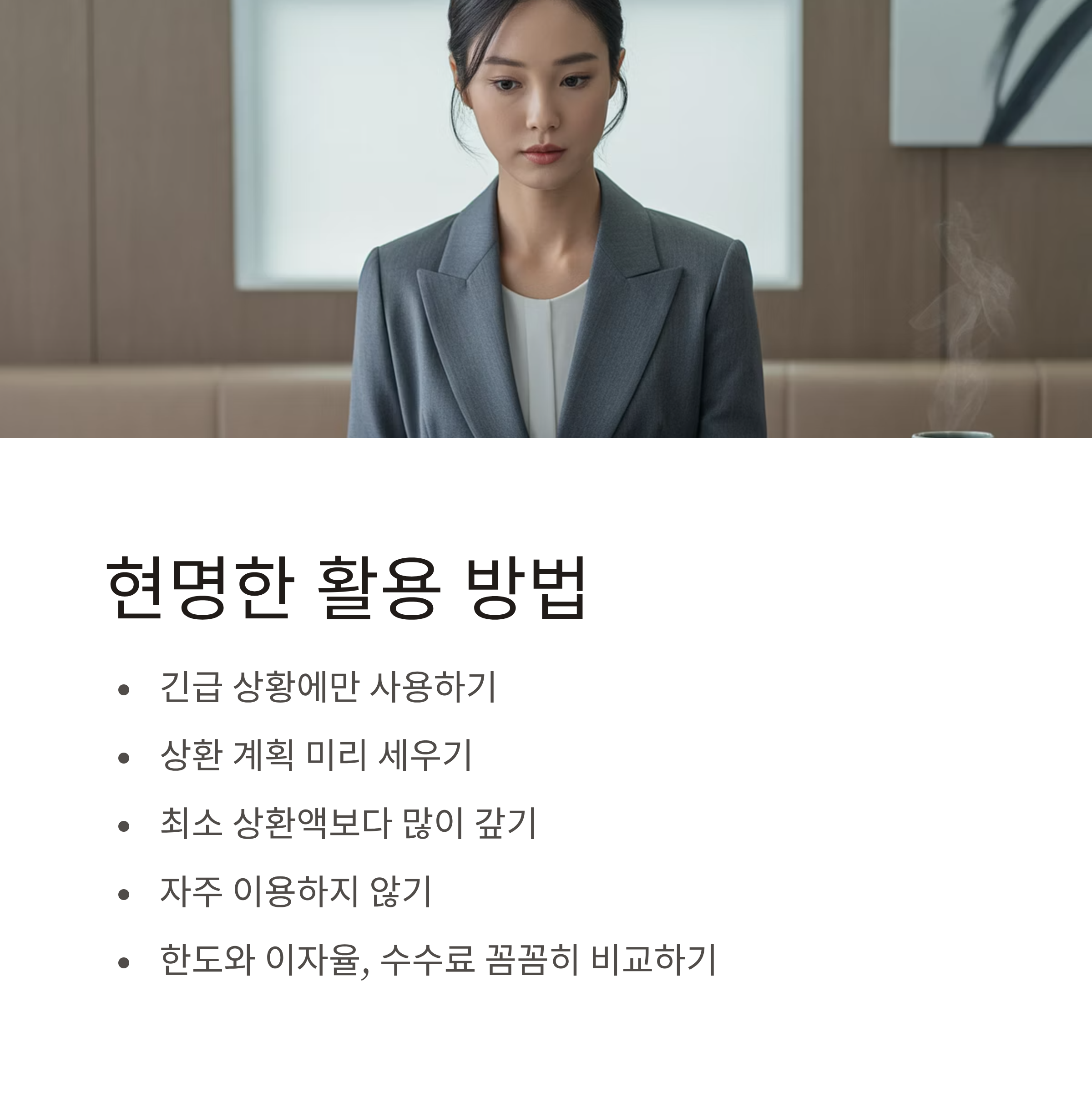 상환 계획 없이 무분별하게 이용할 경우, 오히려 신용에 타격을 줄 수 있습니다. 한도와 이자율, 수수료, 상환 조건을 꼼꼼히 비교