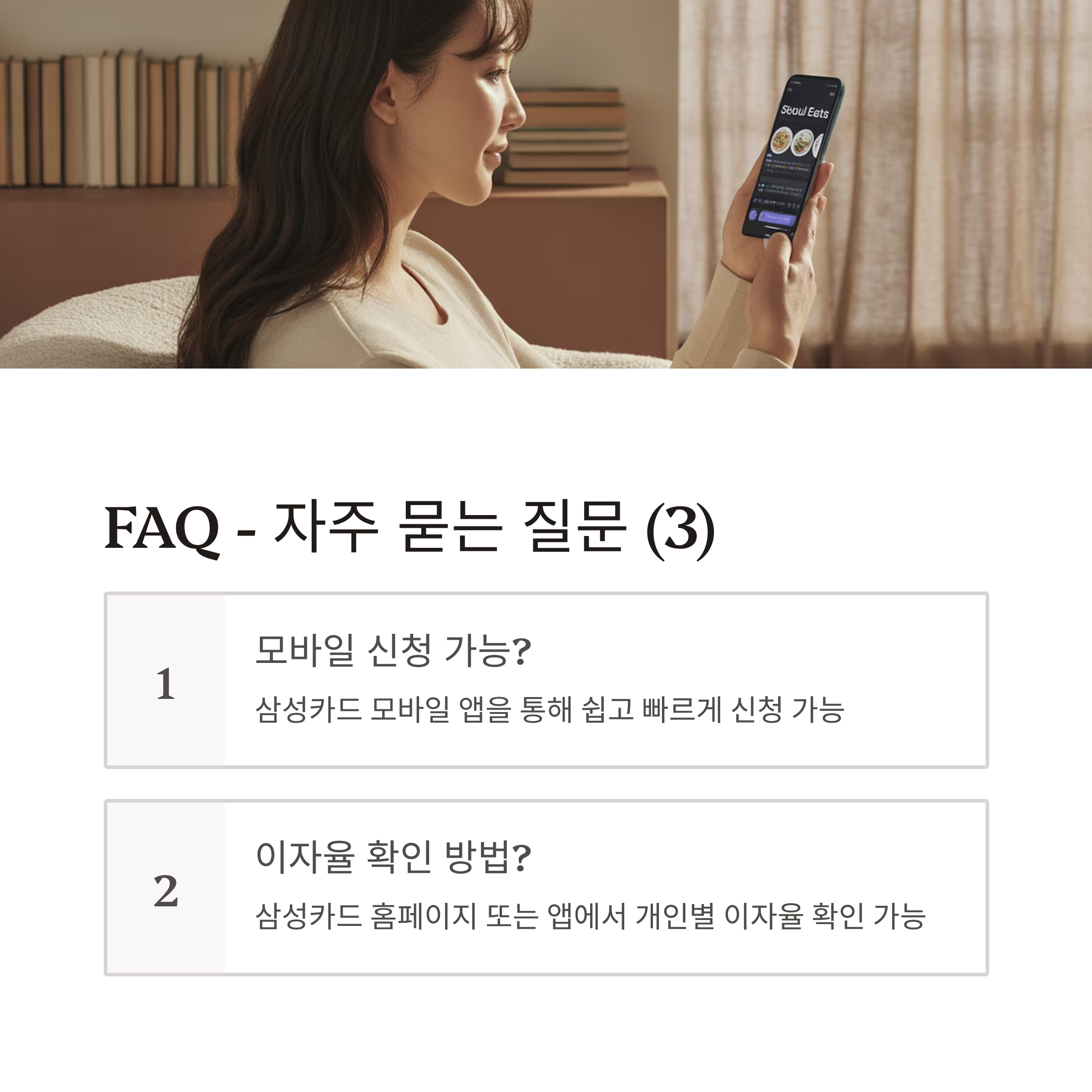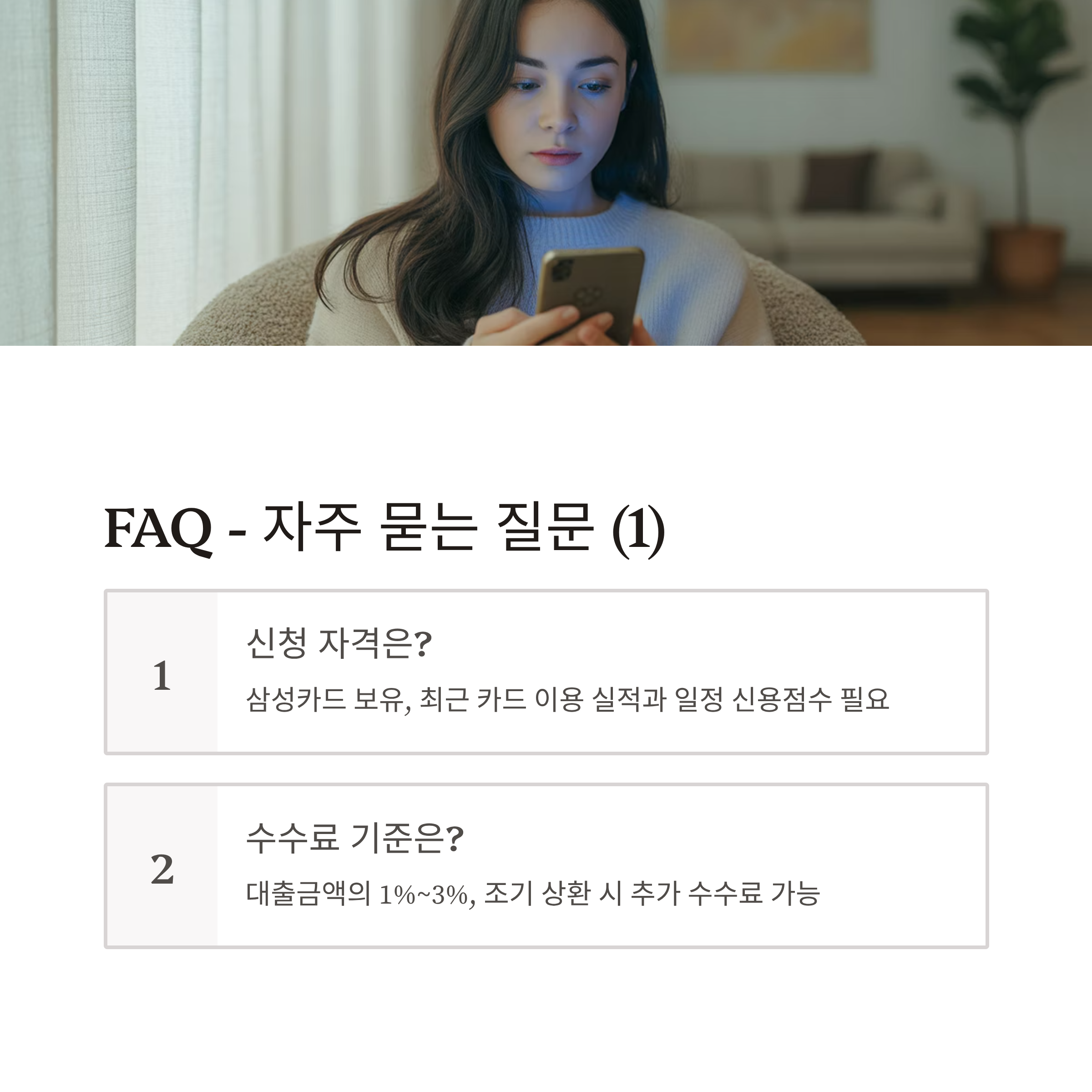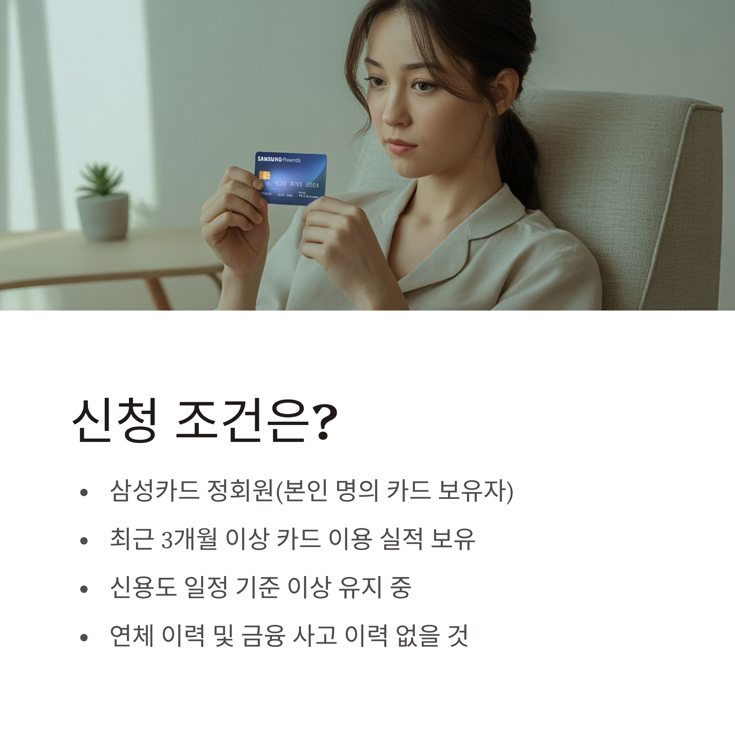 ✔ 삼성카드 정회원(본인 명의 카드 보유자) ✔ 최근 3개월 이상 카드 이용 실적 보유 ✔ 신용도 일정 기준 이상 유지 중 ✔ 연체 이력 및 금융 사고 이력 없을 것