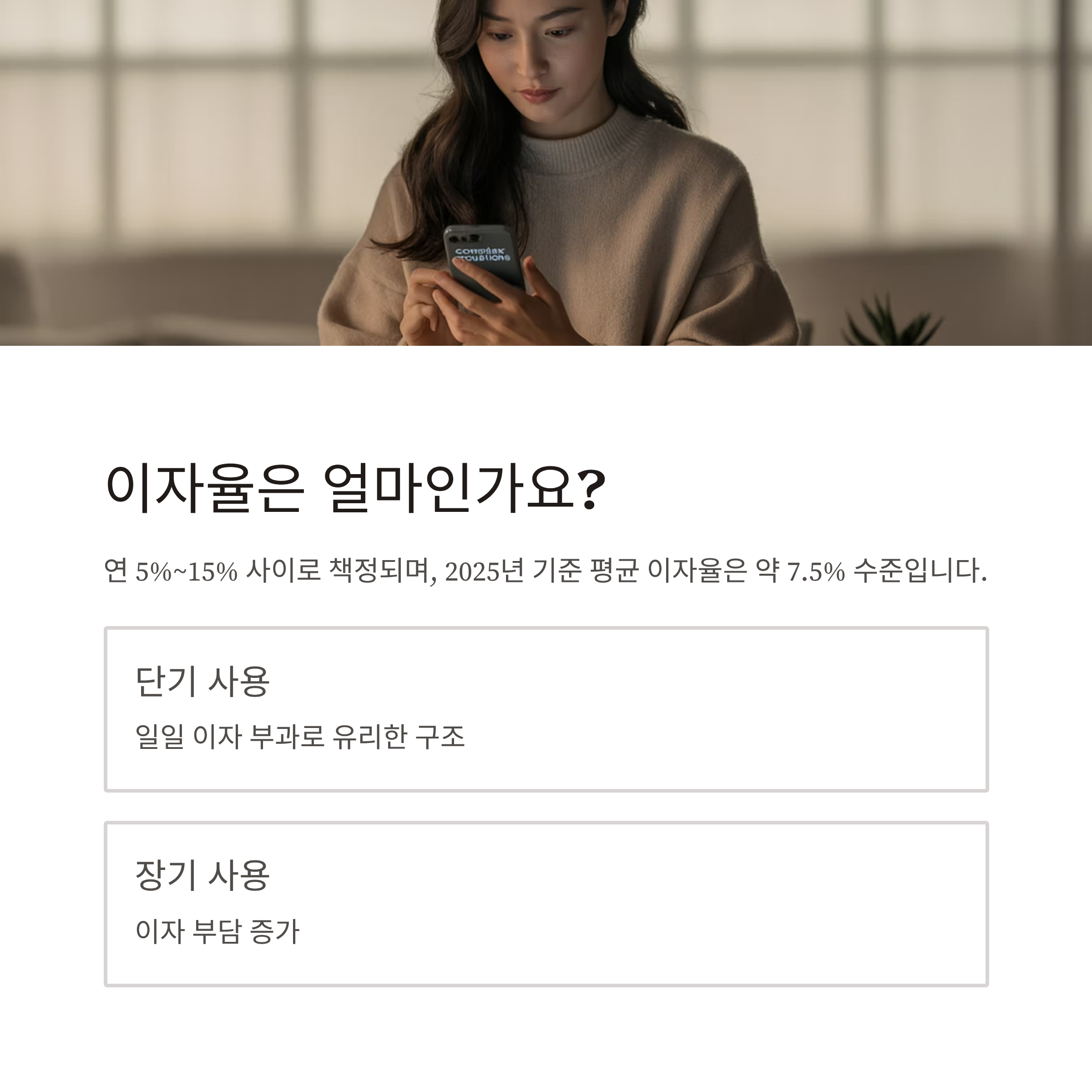 2025년 기준 평균 이자율은 약 7.5% 수준으로, 긴급 자금 수요에는 적절한 수준으로 평가됩니다.