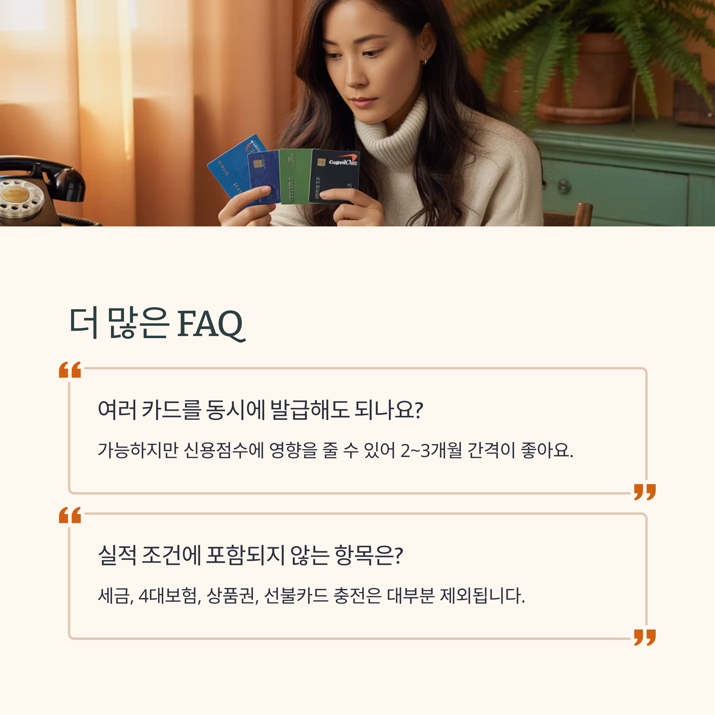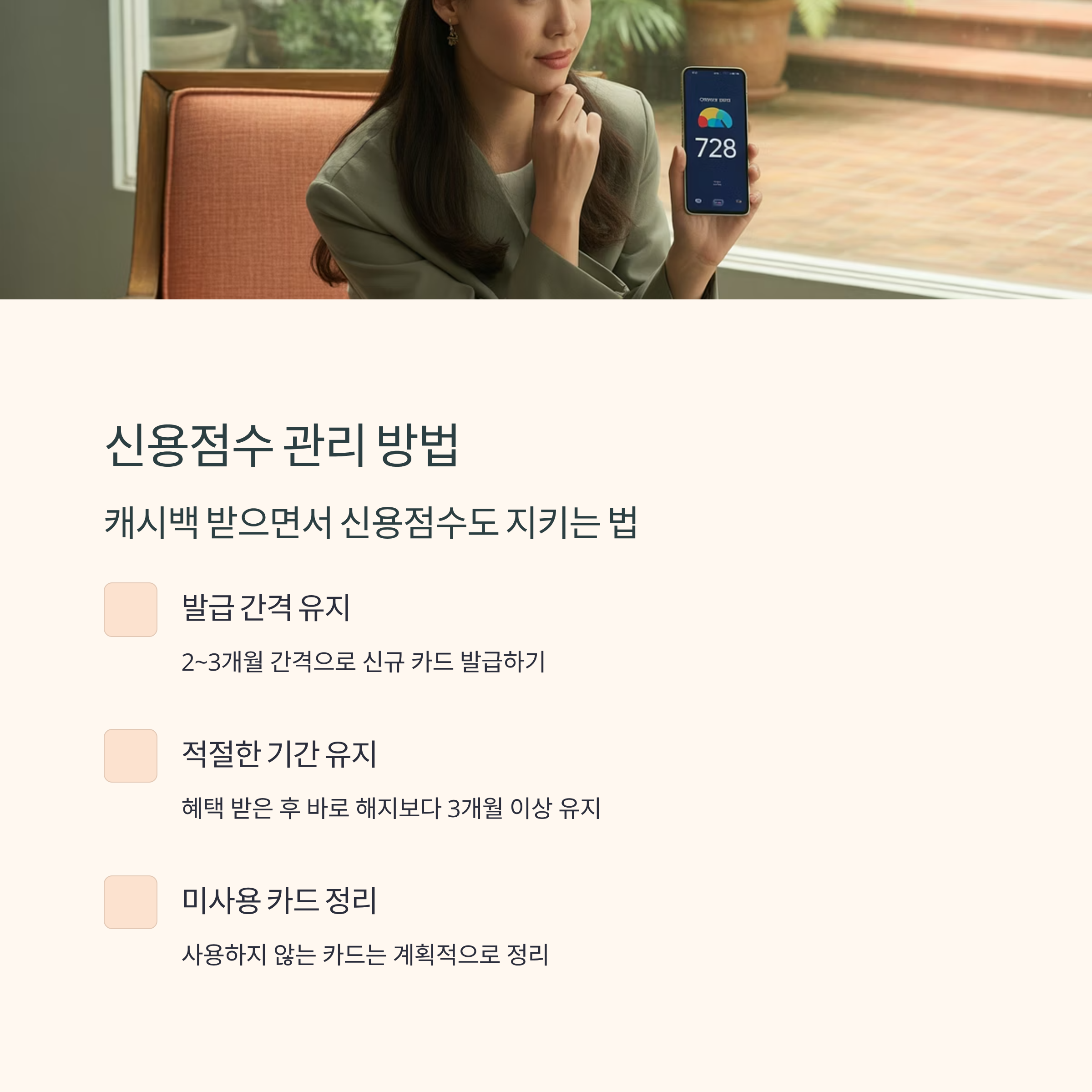 카드 발급 간격을 유지하고, 미사용 카드는 적절히 정리하며, 연체 없이 결제하는 것이 핵심입니다.