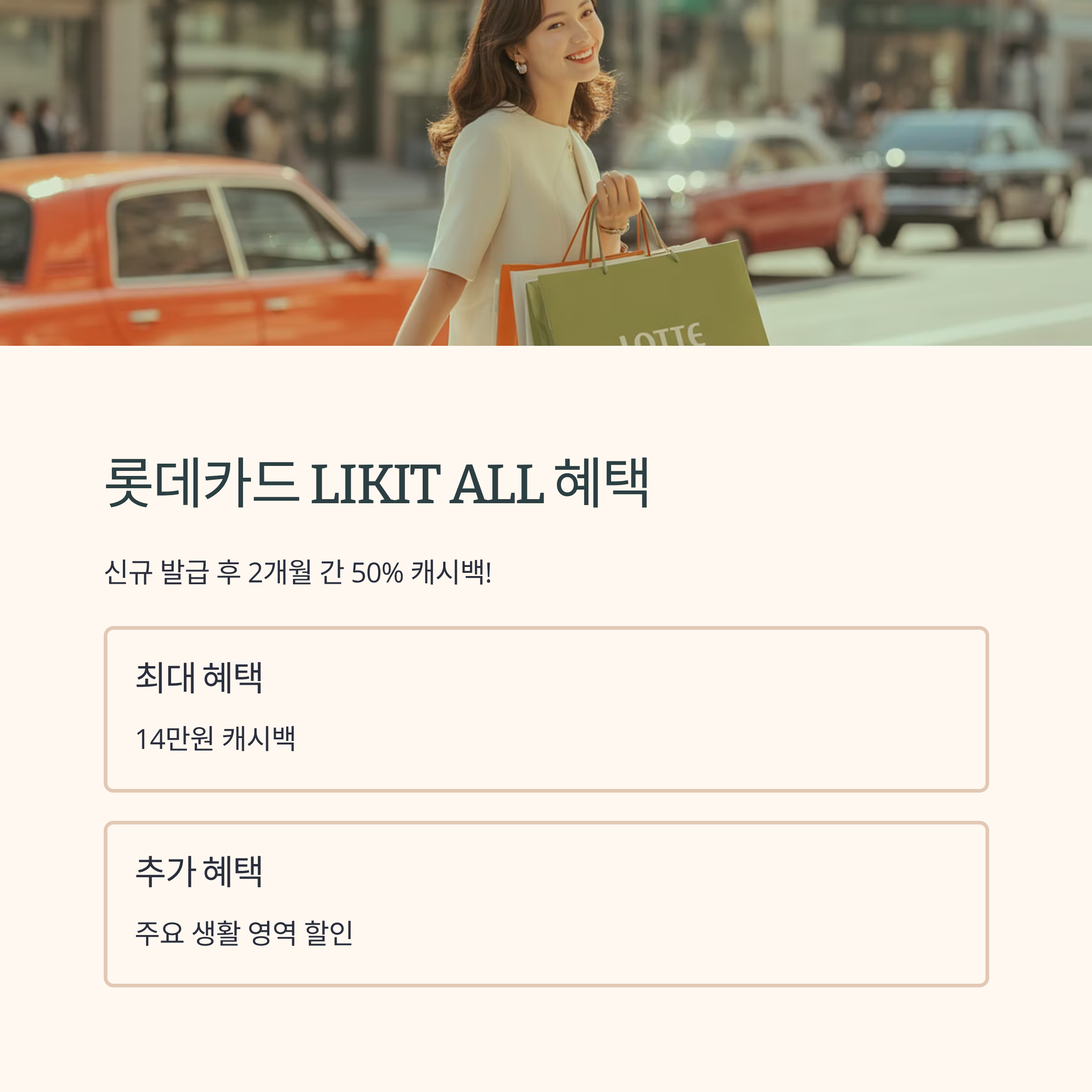 예: 롯데카드 LIKIT ALL은 신규 발급 후 2개월 간 50% 캐시백 제공(최대 14만원)