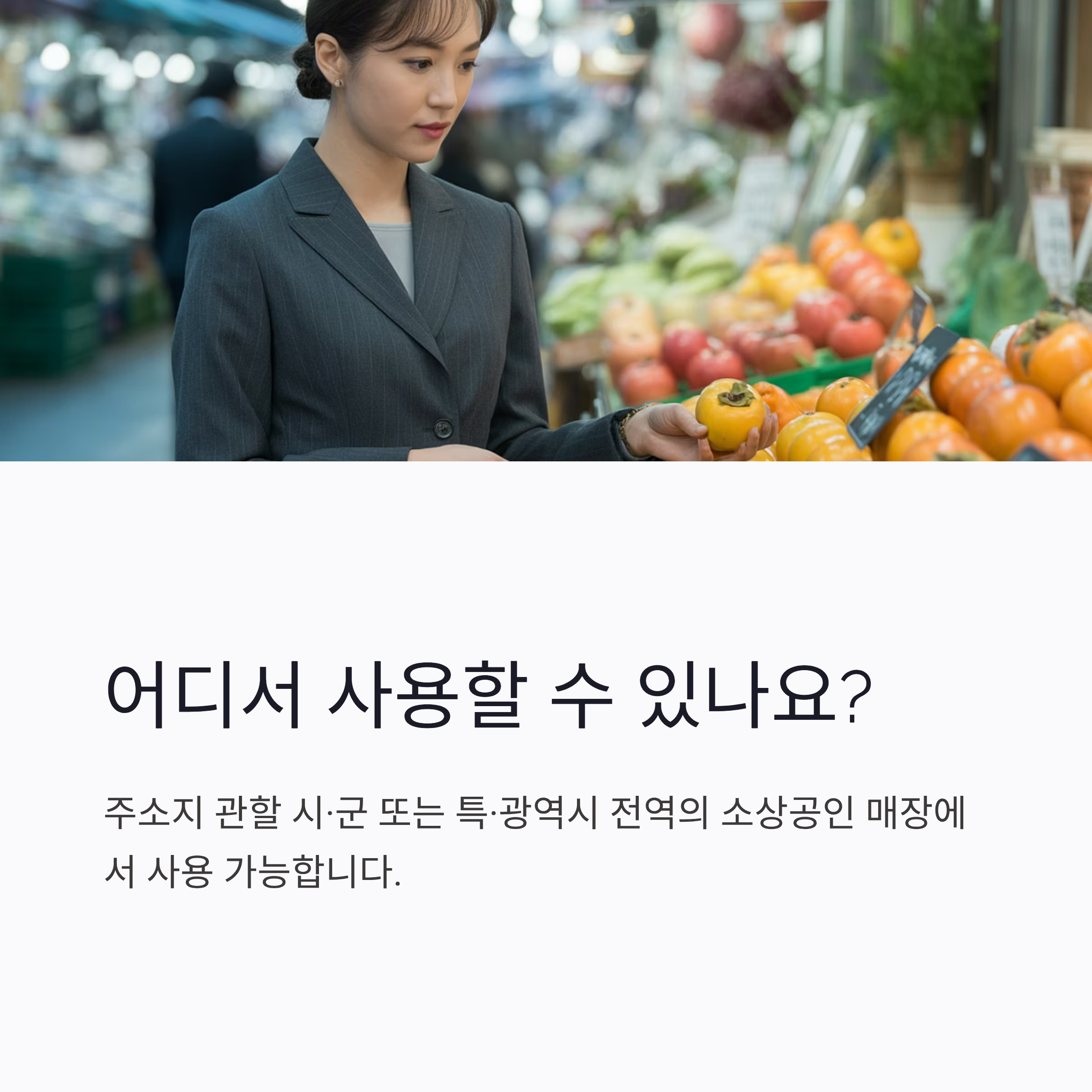 A4. 거주지 시·군 내 소상공인 매장에서 사용 가능하며, 대형마트 및 온라인몰은 제외됩니다.