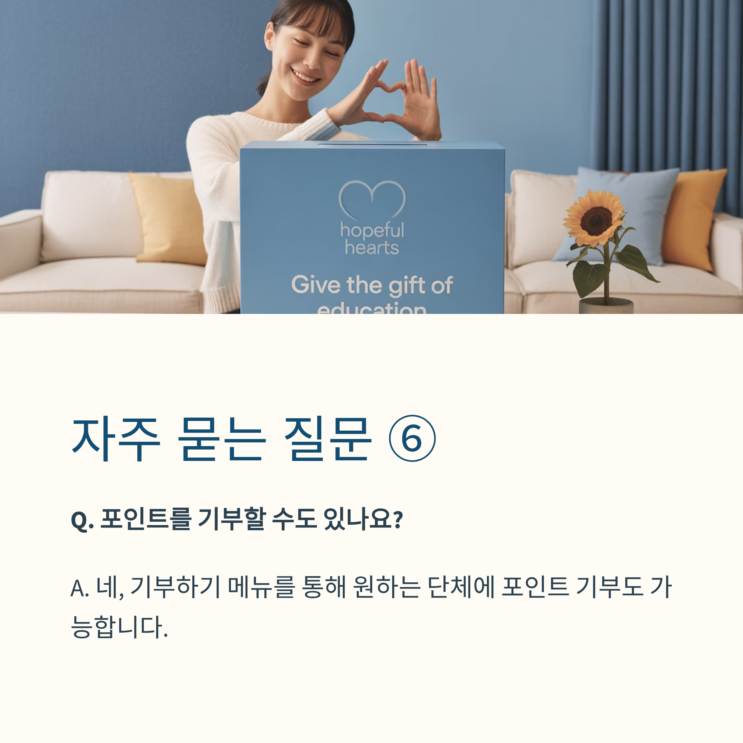 A8. 네. 기부하기 메뉴를 통해 원하는 단체에 포인트 기부도 가능합니다.