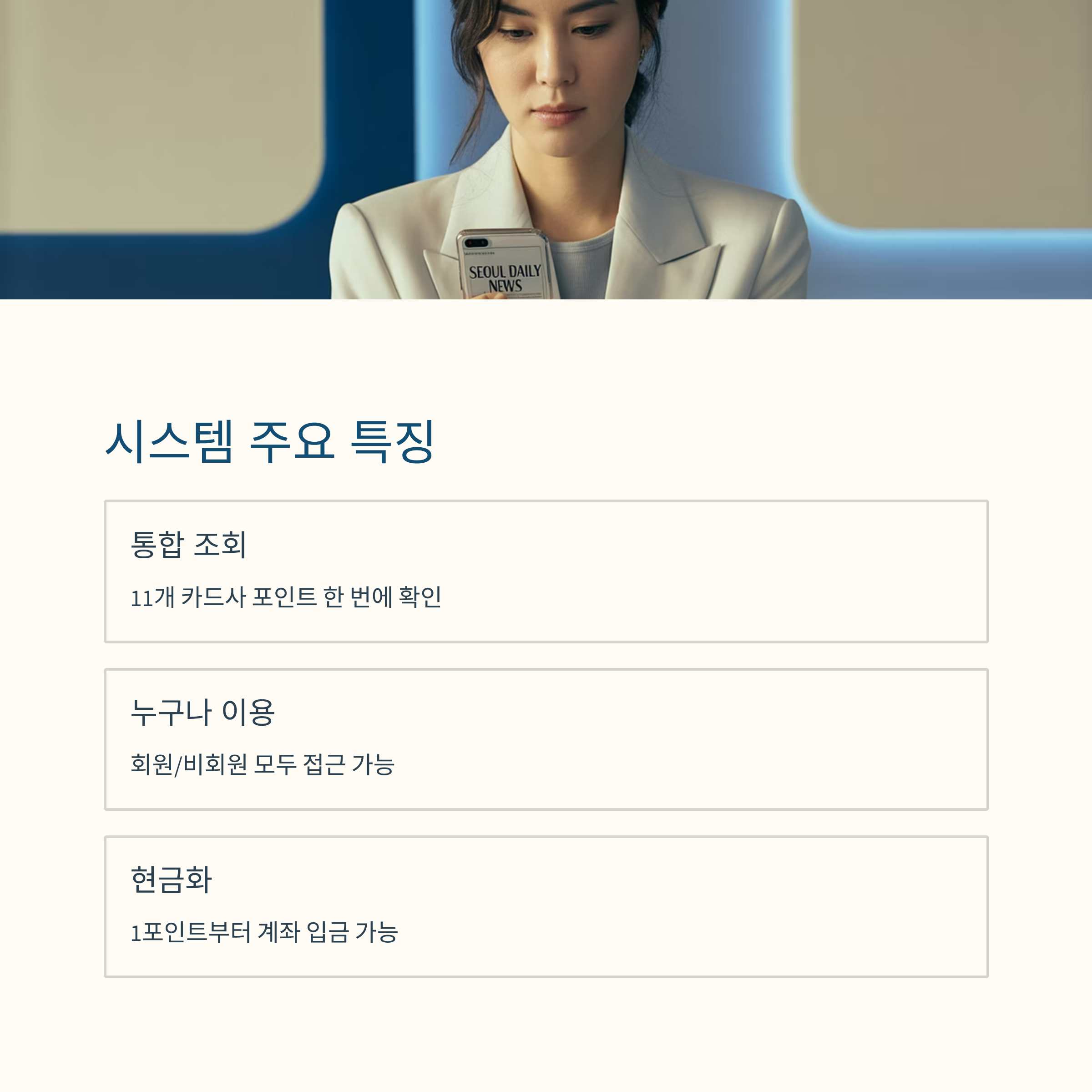 해당 시스템은 신용카드, 체크카드 등에서 적립된 포인트를 통합 조회하고, 필요 시 현금으로 계좌에 입금할 수 있게 도와주는 서비스입니다.