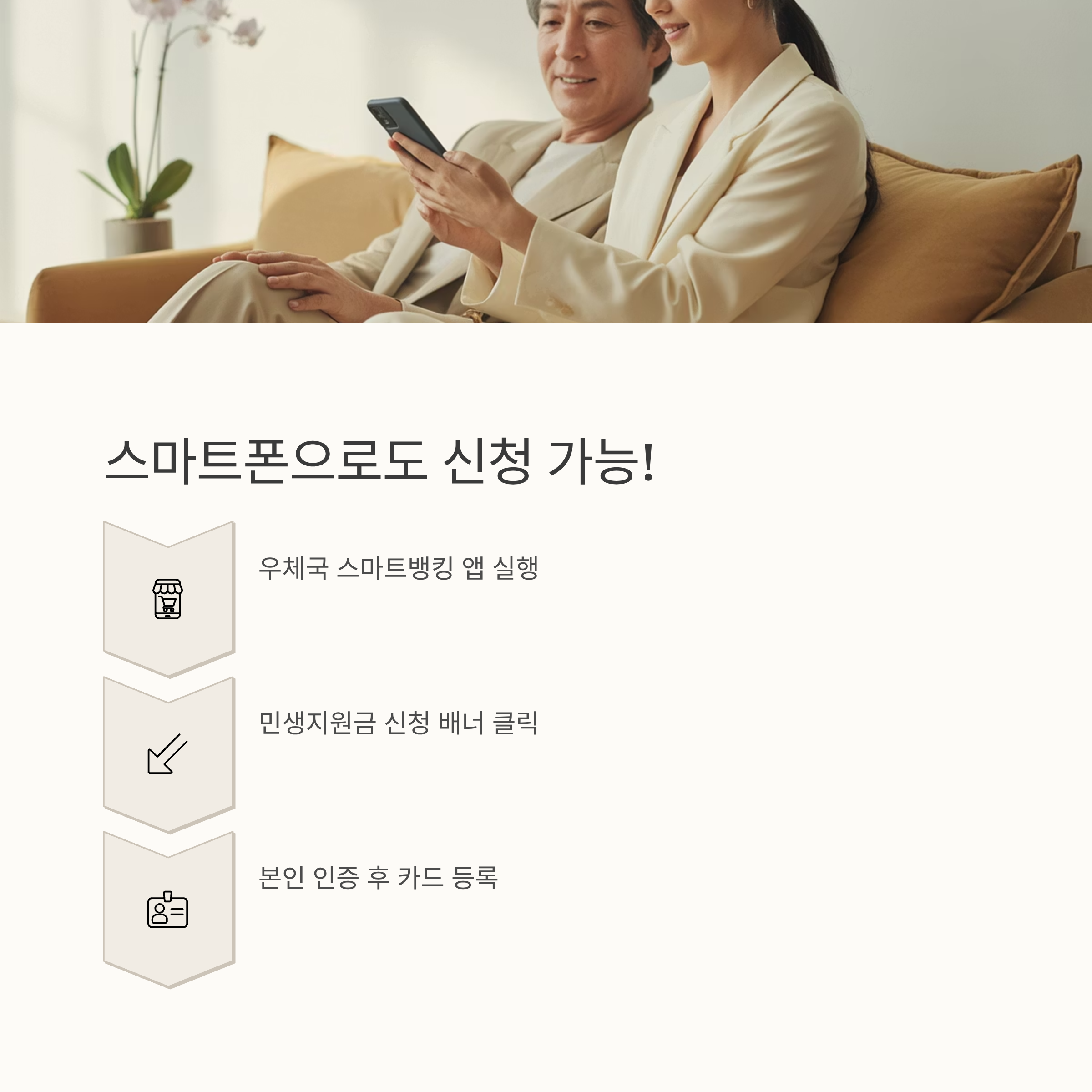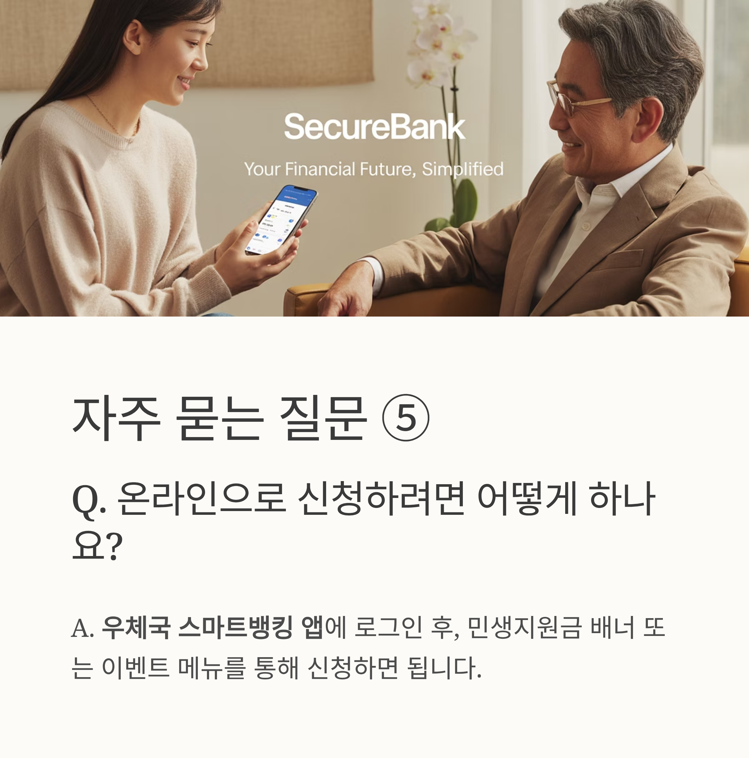 A5. 우체국 스마트뱅킹 앱에 로그인 후, 민생지원금 배너 또는 이벤트 메뉴를 통해 신청하면 됩니다.