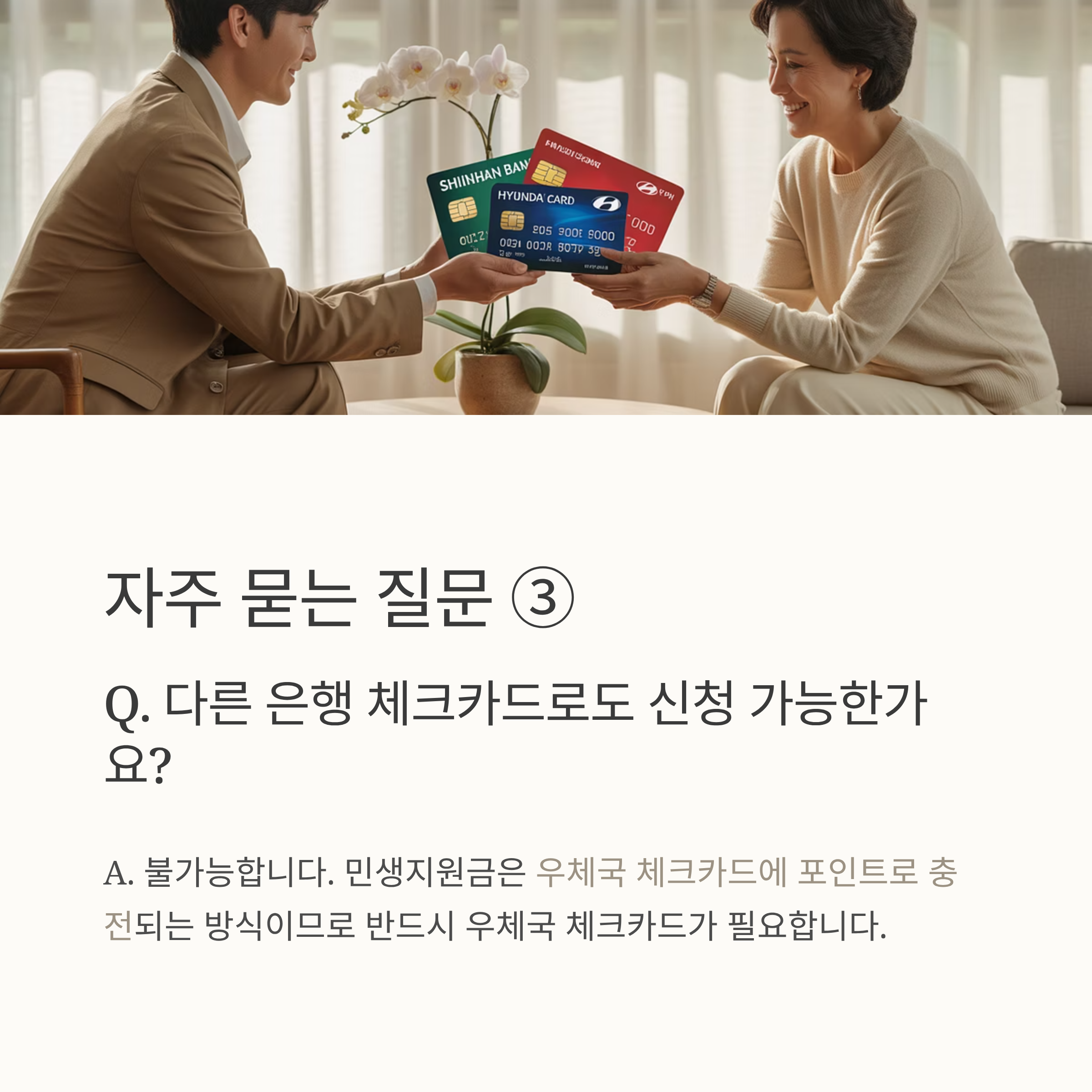 A3. 불가능합니다. 민생지원금은 우체국 체크카드에 포인트로 충전되는 방식입니다.