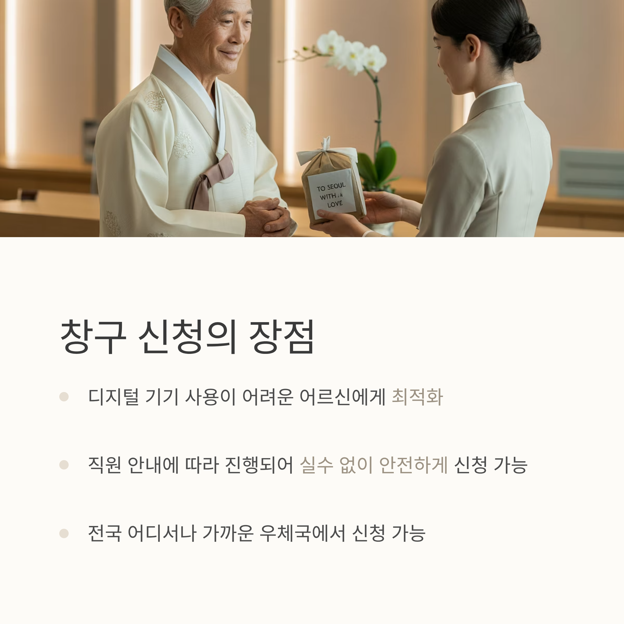 아날로그 방식에 익숙한 분들을 위한 우체국 창구 신청 방법은 다음과 같습니다.