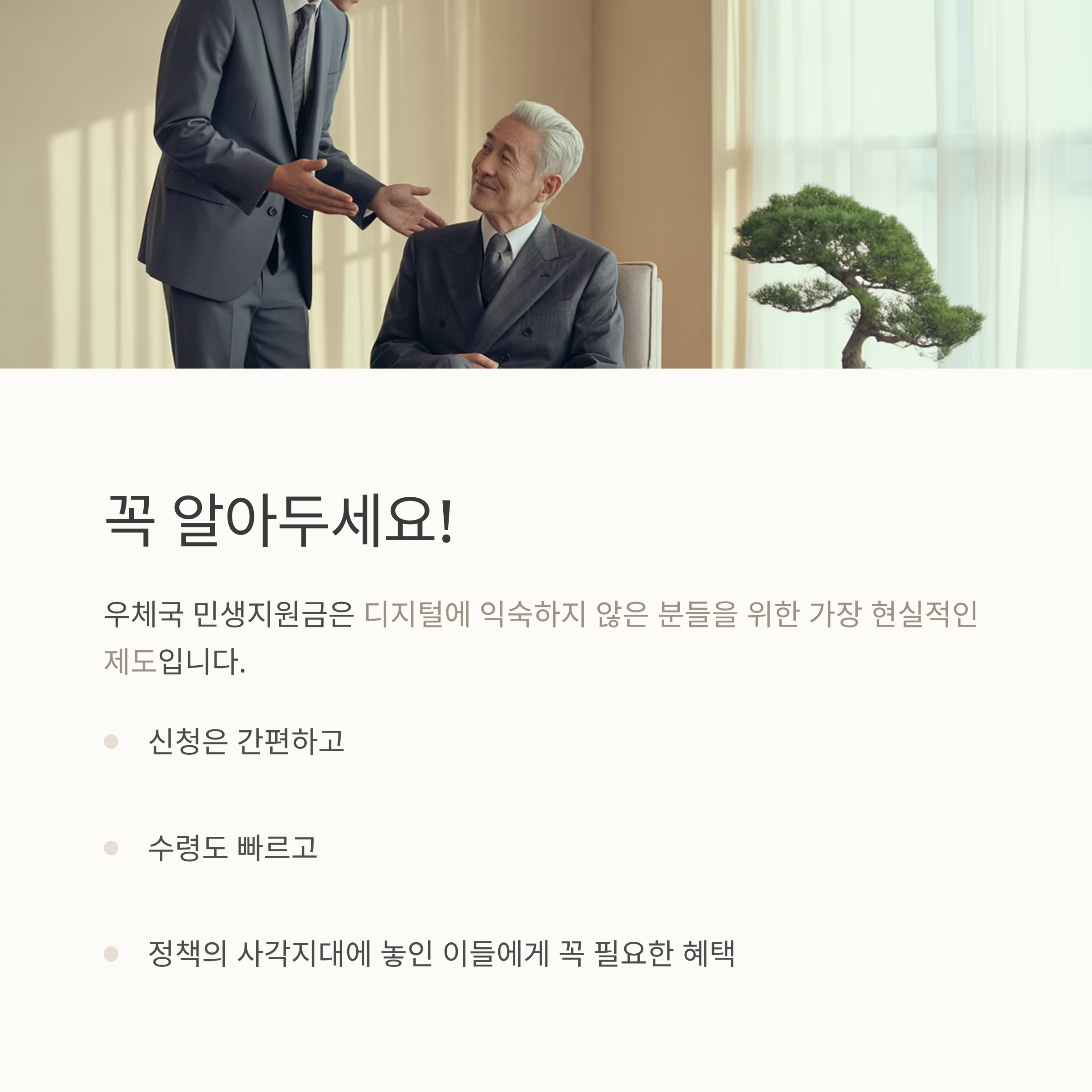 ✅ 정책의 사각지대에 놓인 이들에게 꼭 필요한 제도부모님이나 주변 어르신들이 아직 신청하지 않으셨다면,