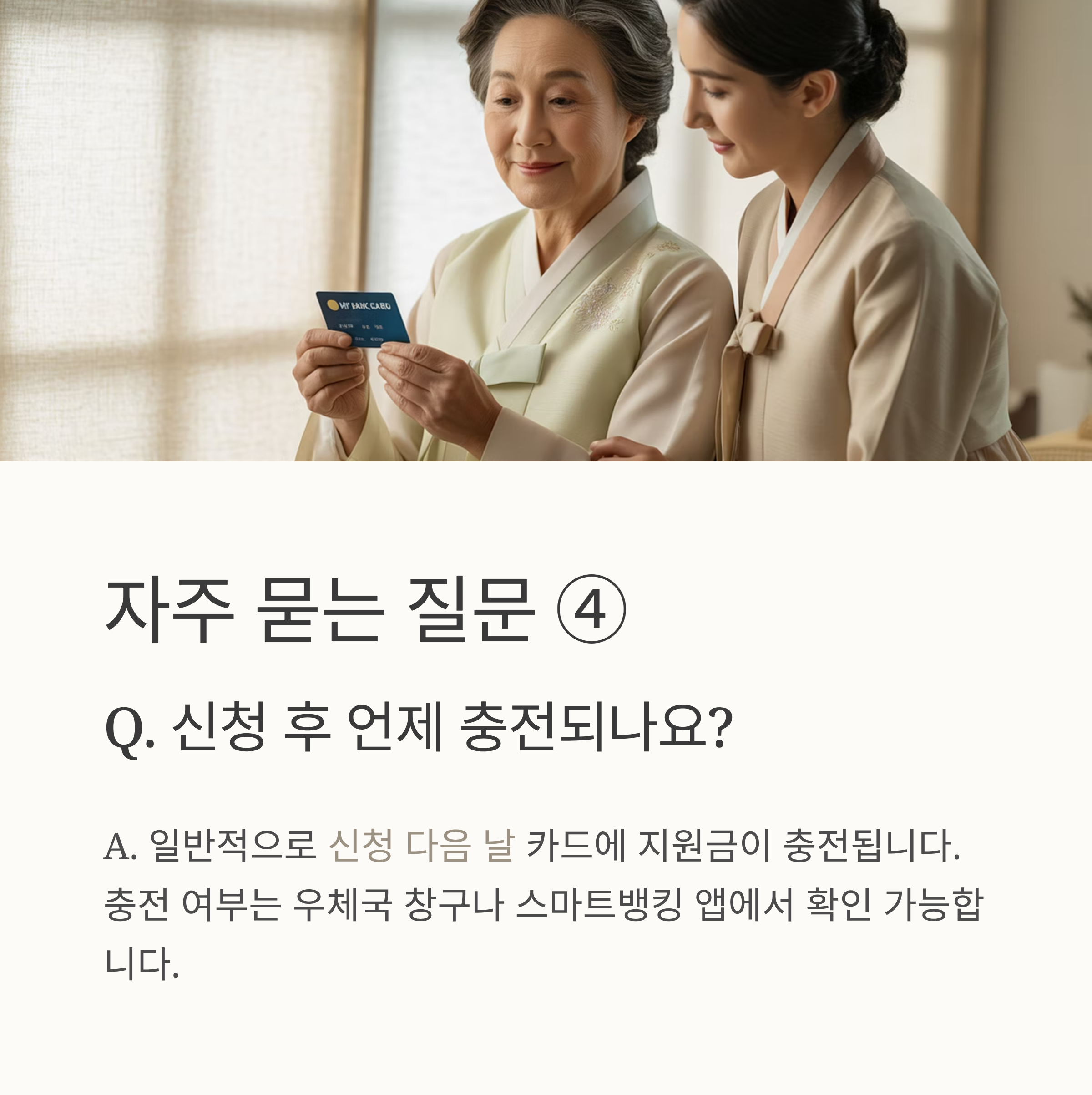 A4. 일반적으로 신청 다음 날 카드에 지원금이 충전됩니다.