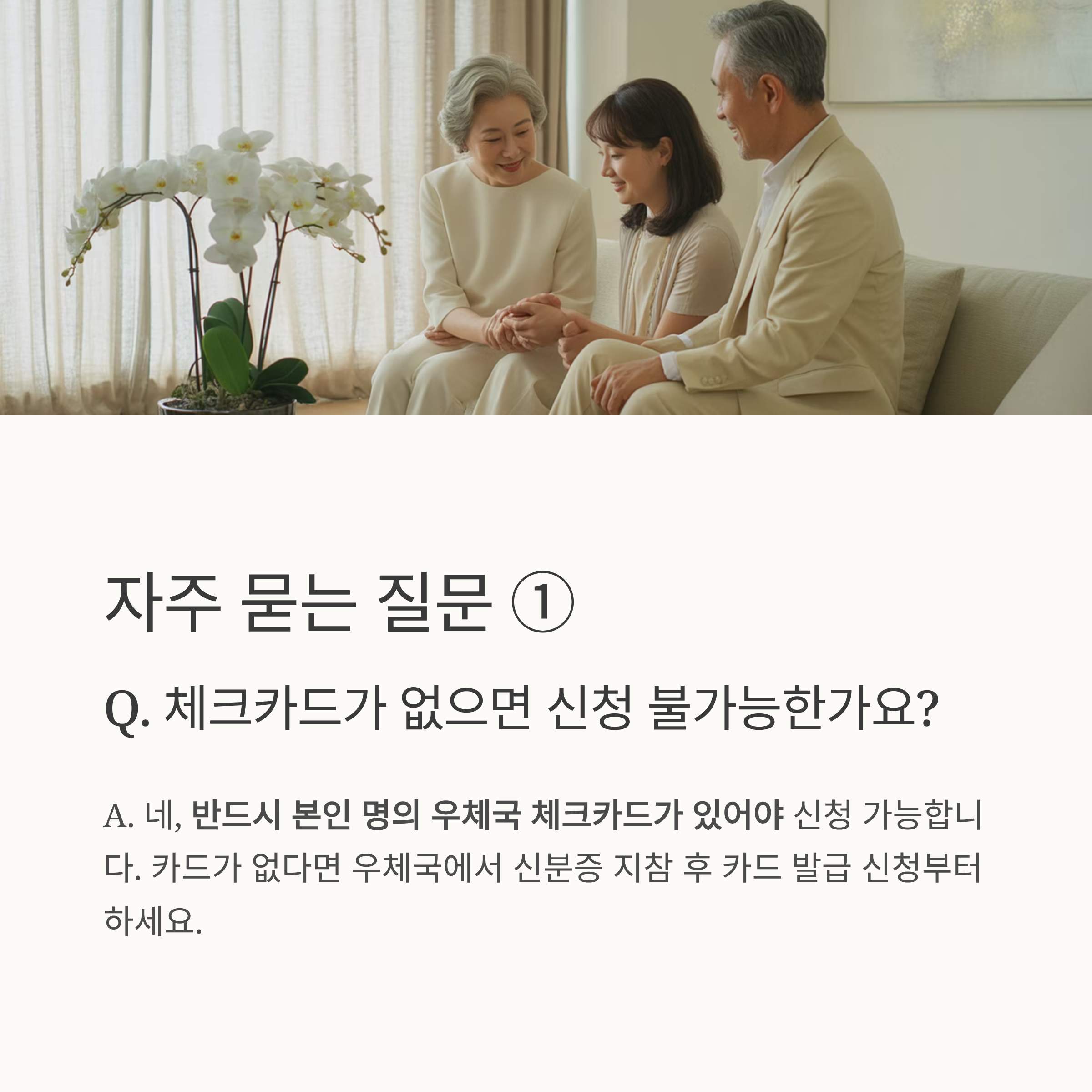 A1. 네, 반드시 본인 명의 우체국 체크카드가 있어야 신청 가능합니다. 카드가 없다면 우체국 창구에서