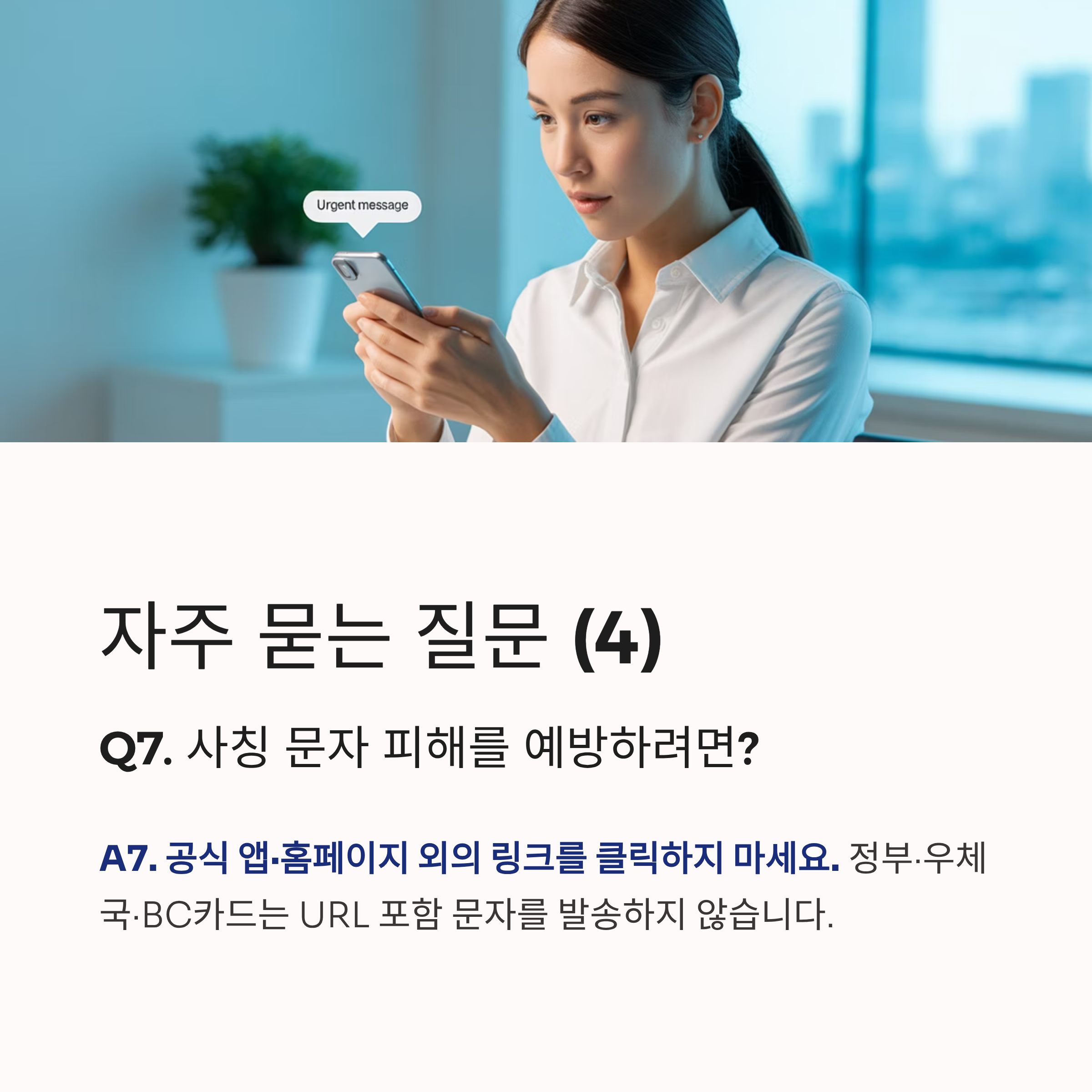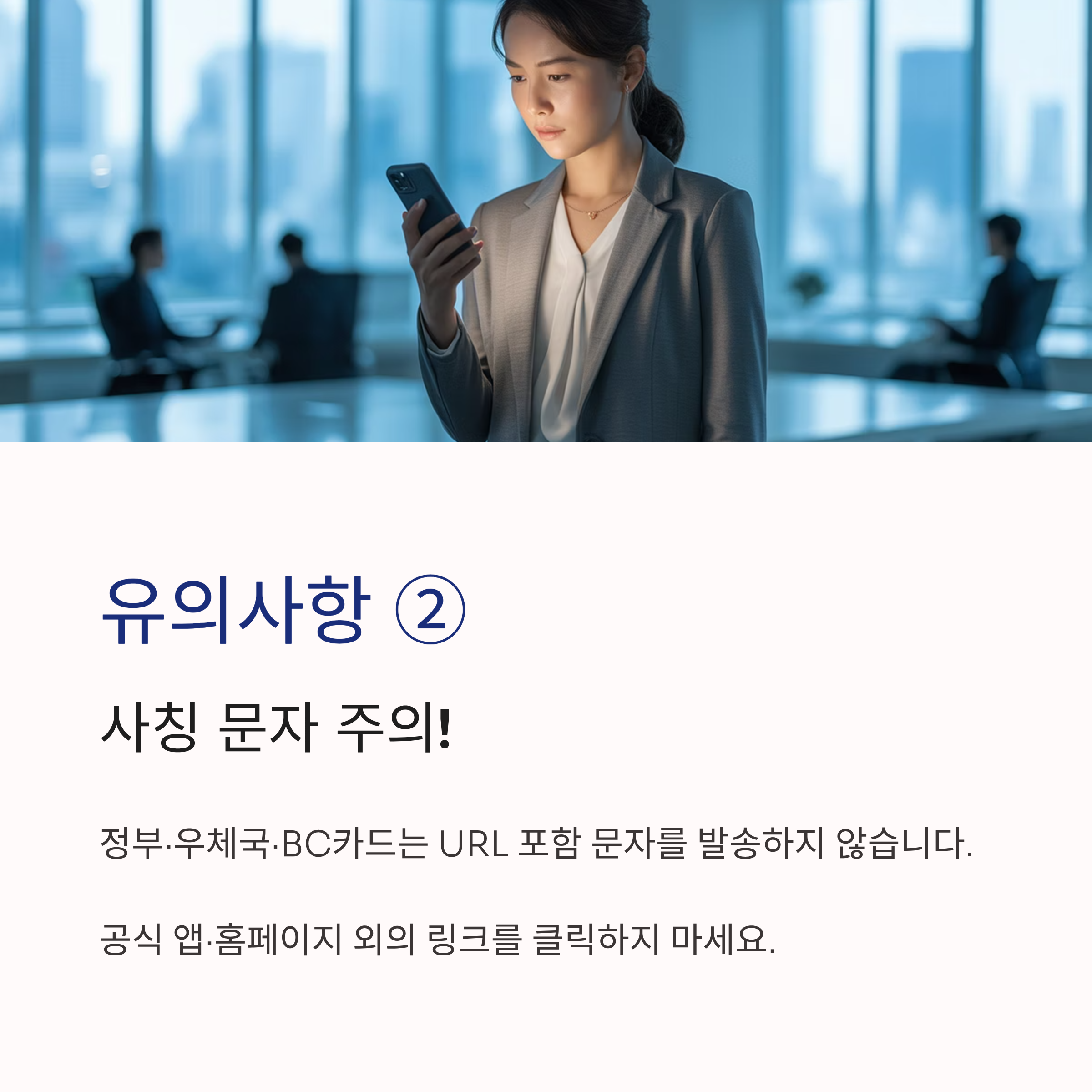 - 사칭 문자 주의: 정부·우체국·BC카드는 URL 포함 문자 발송 안 함