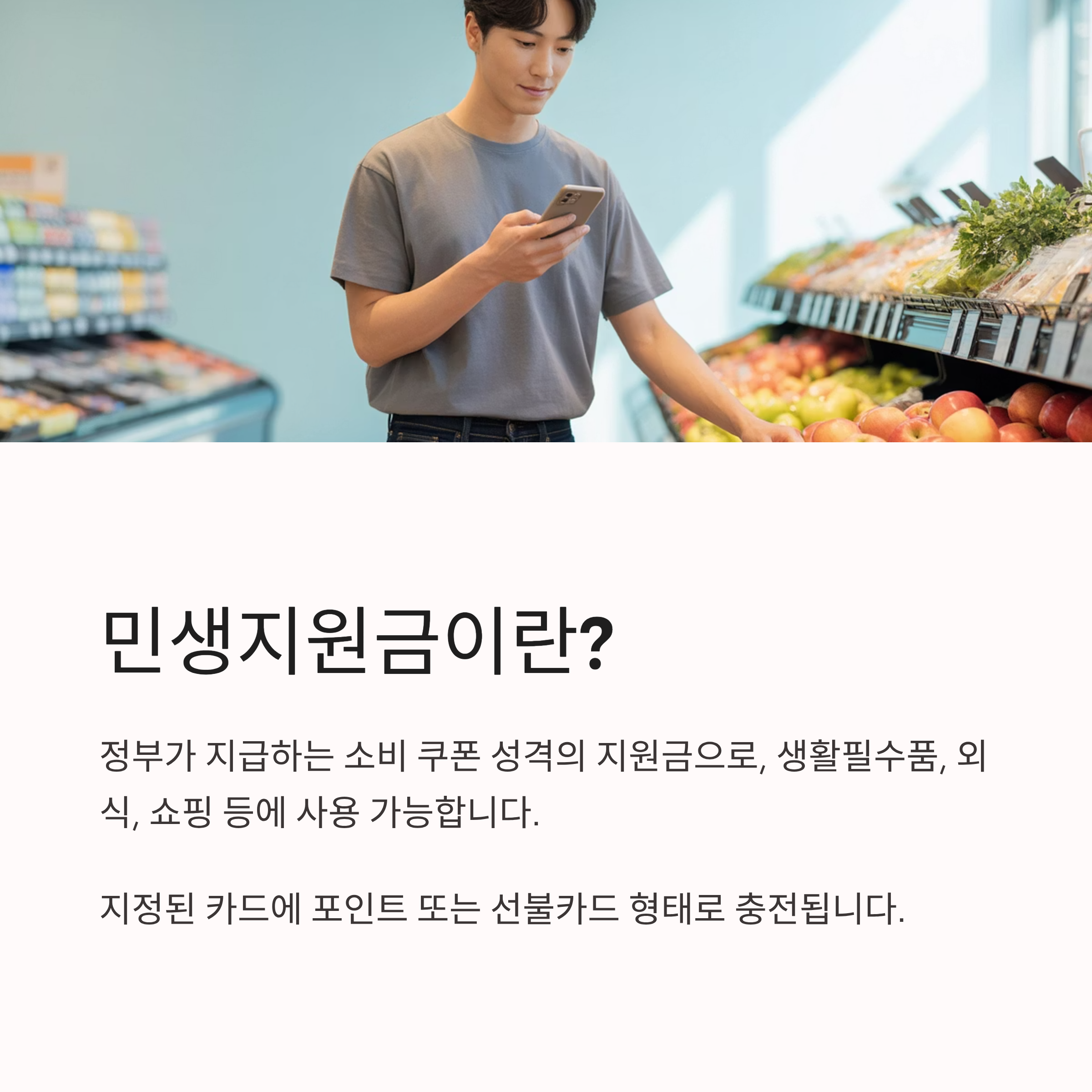 민생지원금은 정부가 지급하는 소비 쿠폰 성격의 지원금으로, 지정된 카드에 포인트 또는 선불카드 형태로 충전됩니다.