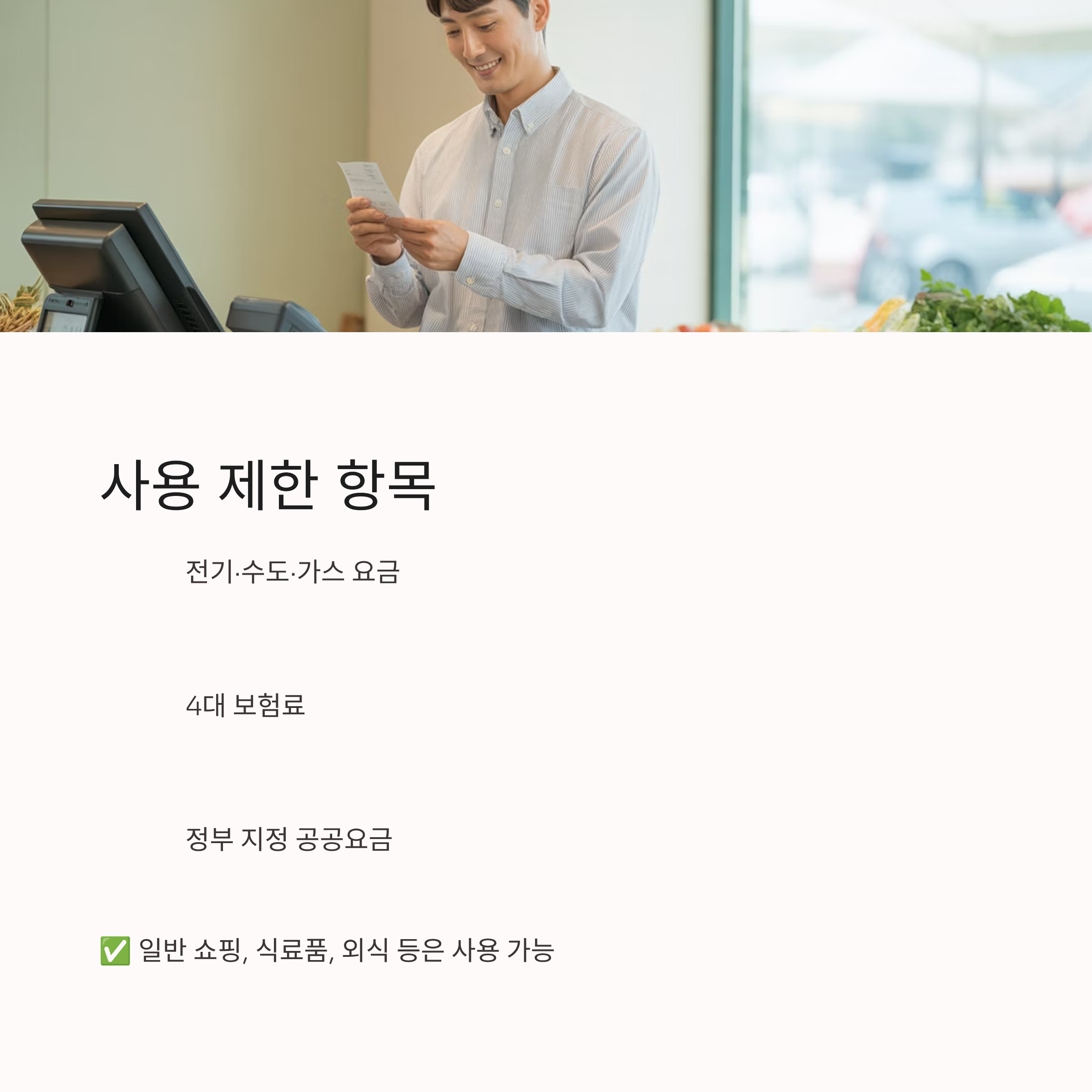 생활필수품, 외식, 쇼핑 등에 사용 가능하지만 공과금 등 일부 항목은 사용 불가합니다.