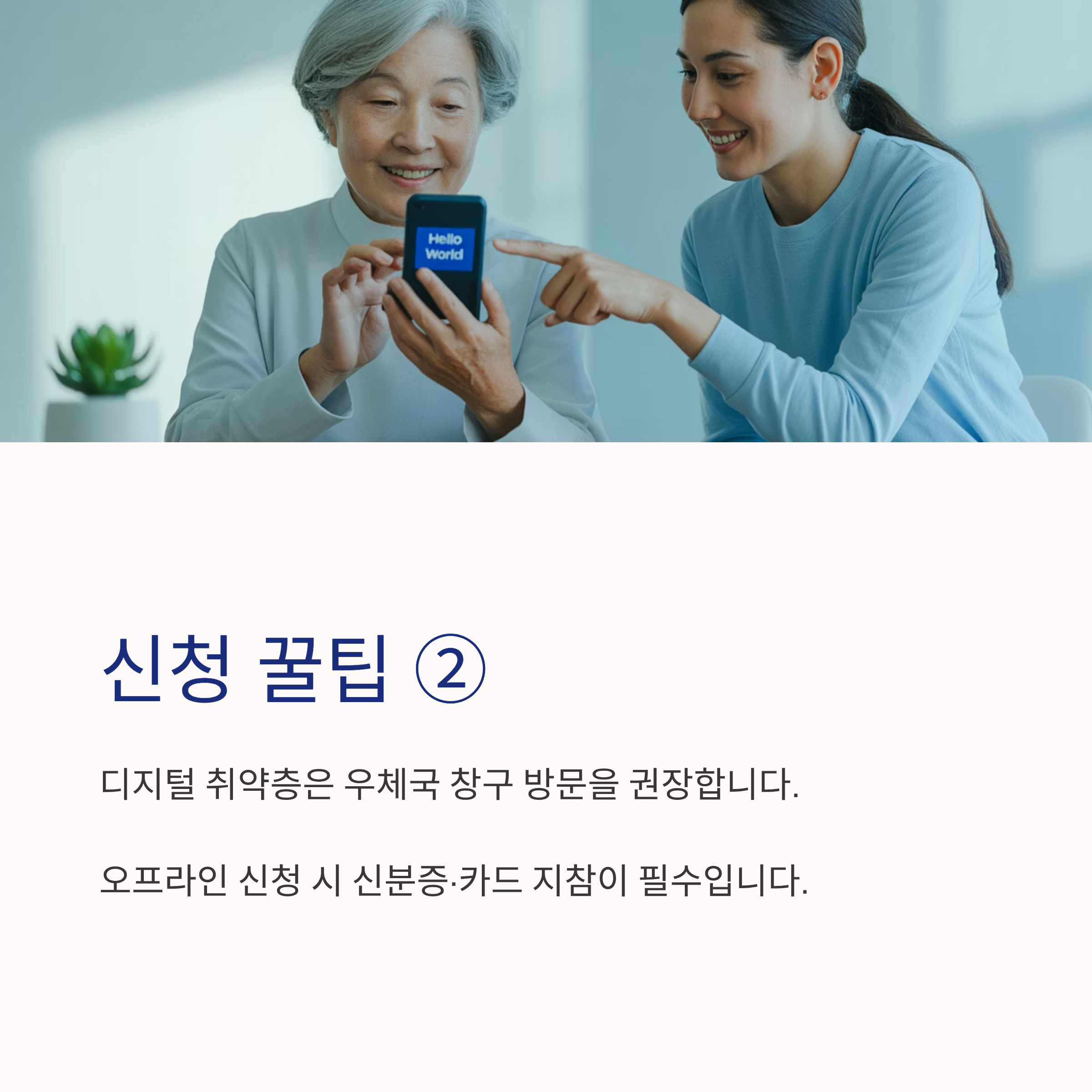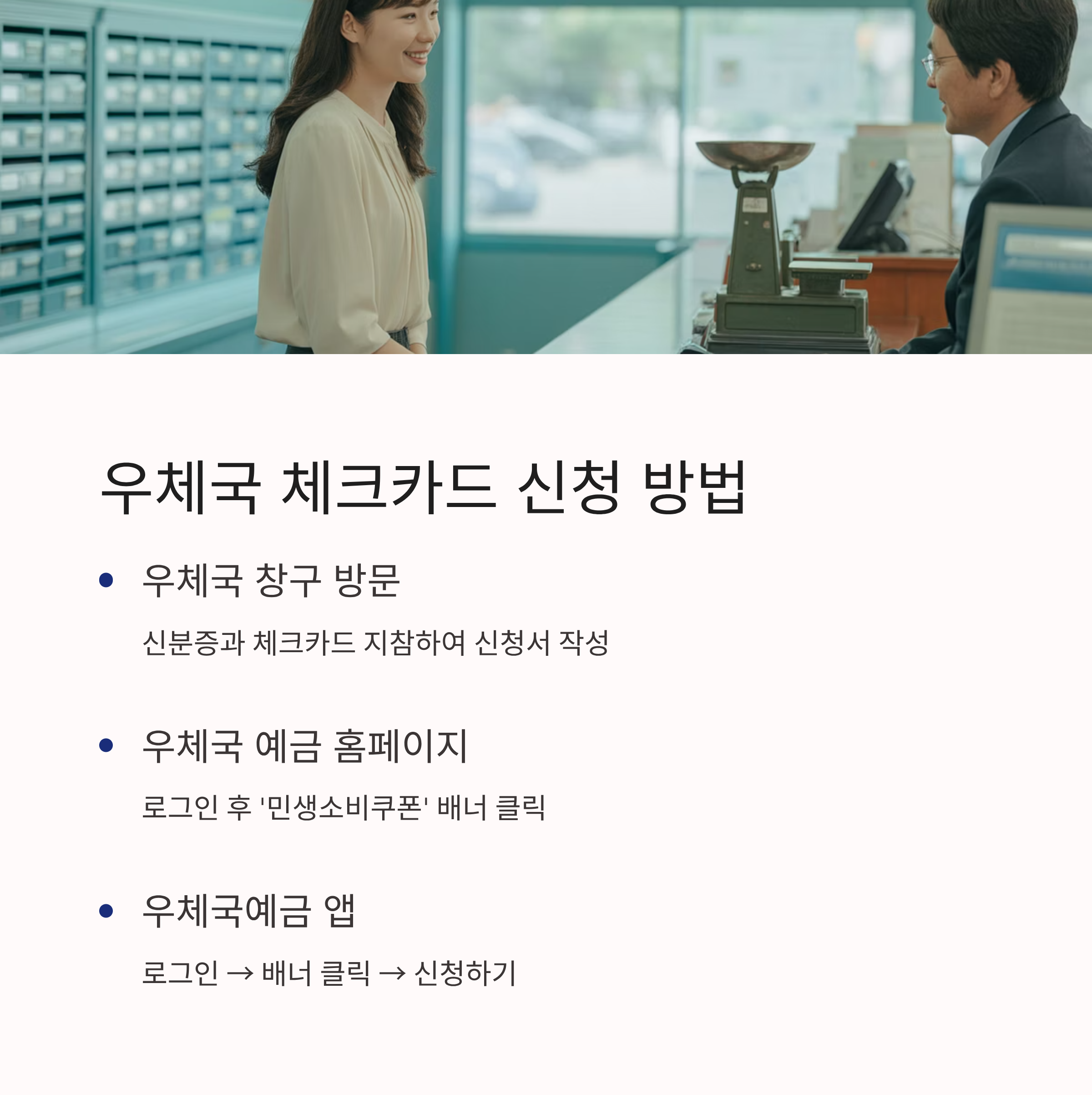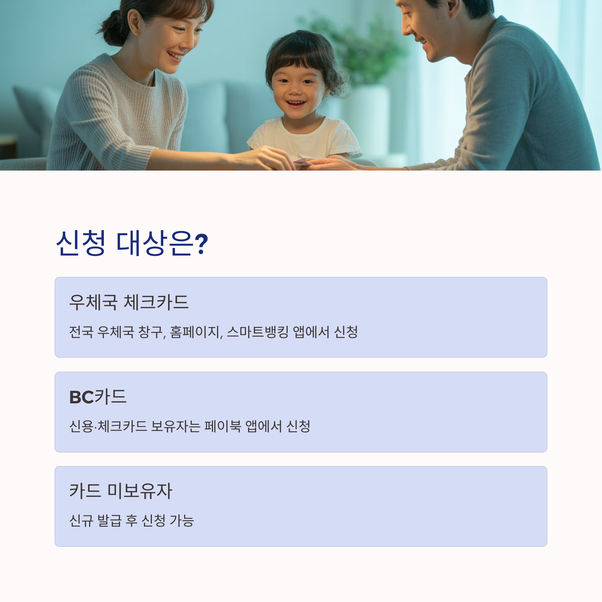 - 우체국 체크카드 보유자: 전국 우체국 창구·홈페이지·스마트뱅킹 앱을 통해 신청 가능
