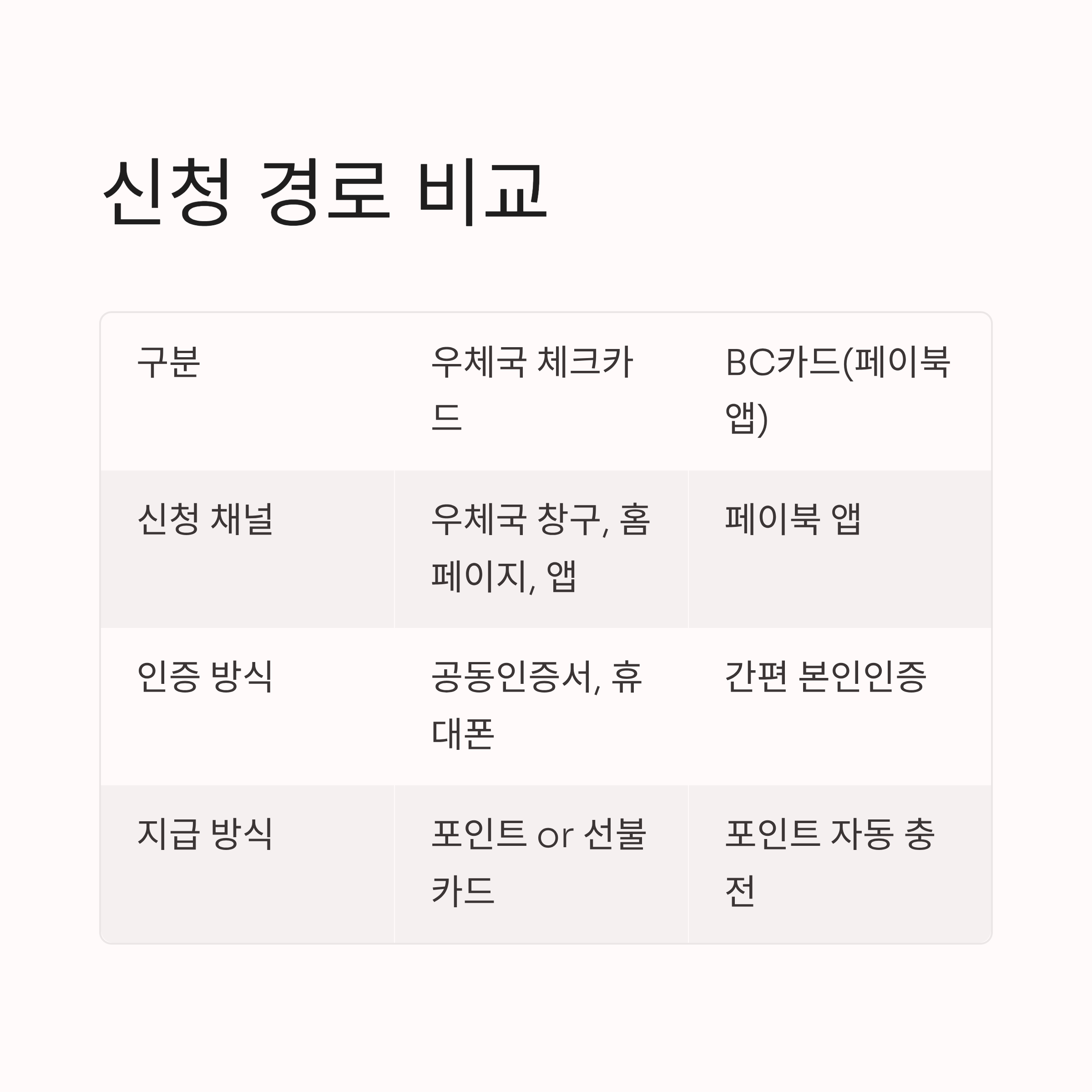 | 신청 대상 | 우체국 체크카드 보유자 | BC계열 카드 보유자 |