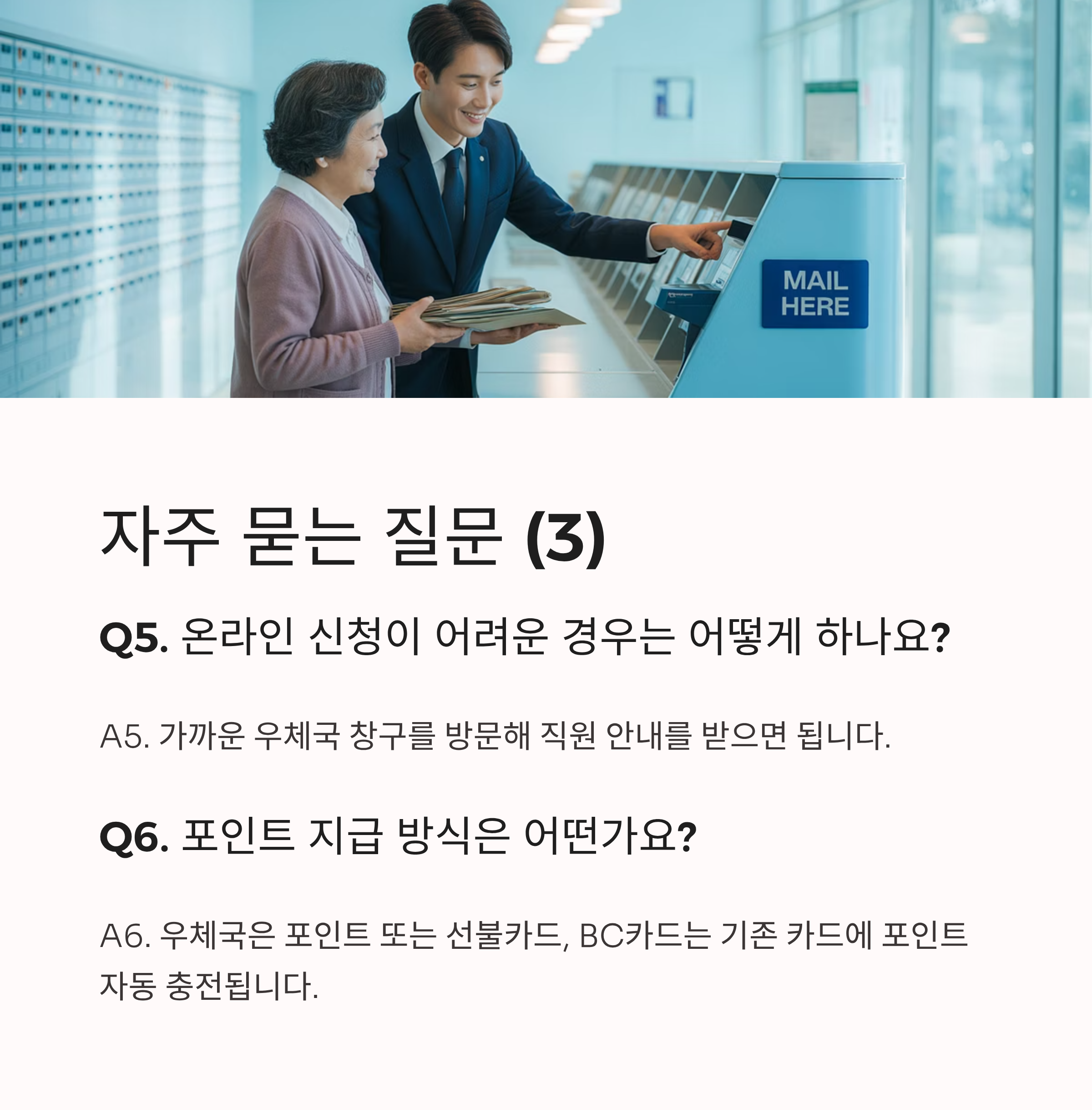 A5. 가까운 우체국 창구를 방문해 직원 안내를 받으면 됩니다.